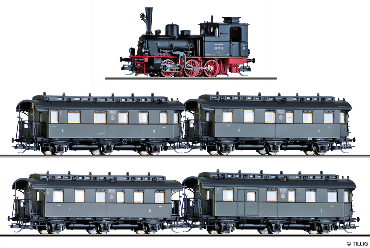 | set parní lokomotivy BR 89 a čtyř osobních tříosých vozů |