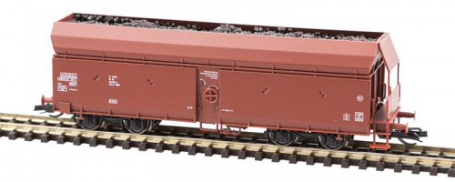 | samovýsypný vůz červenohnědý s nákladem uhlí |