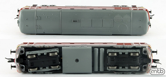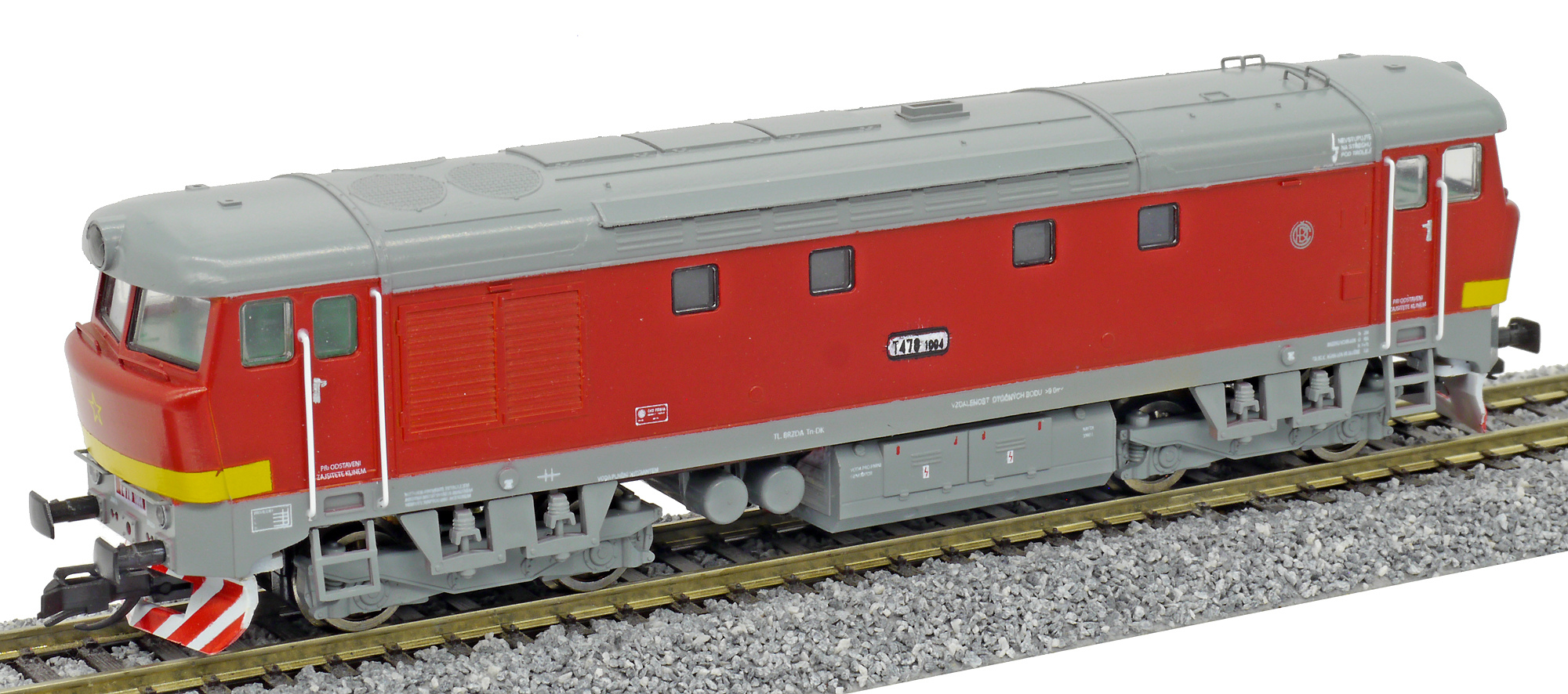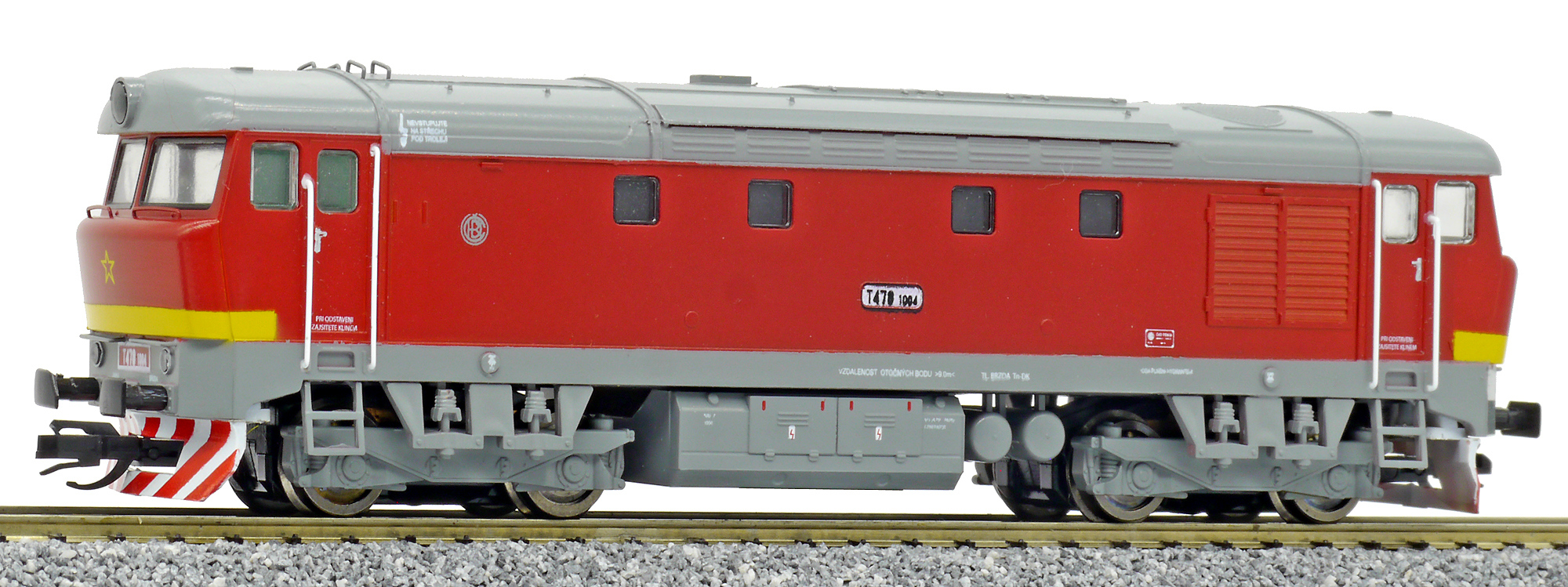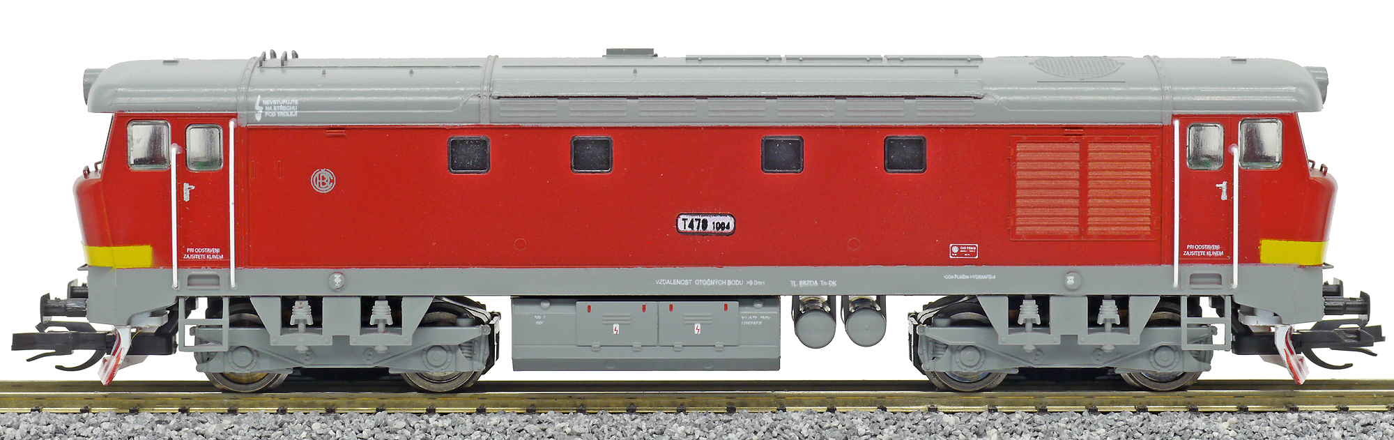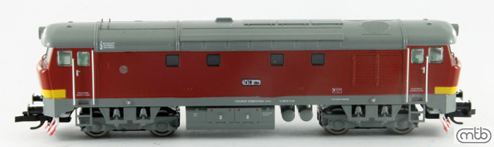 Popis   dieselová lokomotiva červená s šedou střechou, rámem a pojezdem