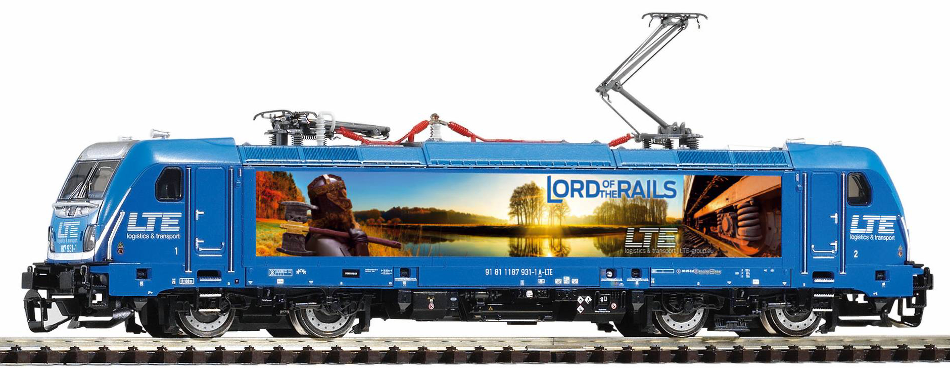 | elektrická lokomotiva světle šedá-modrá s potiskem „LORD OF THE RAILS“ |