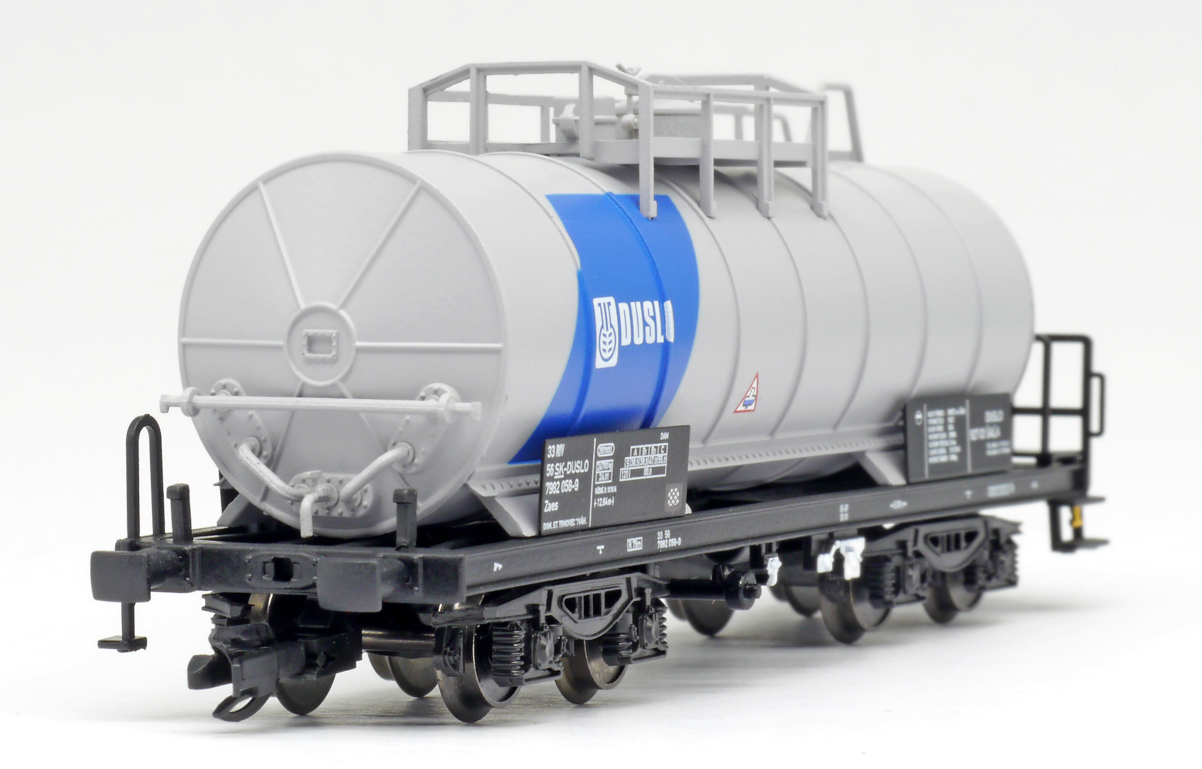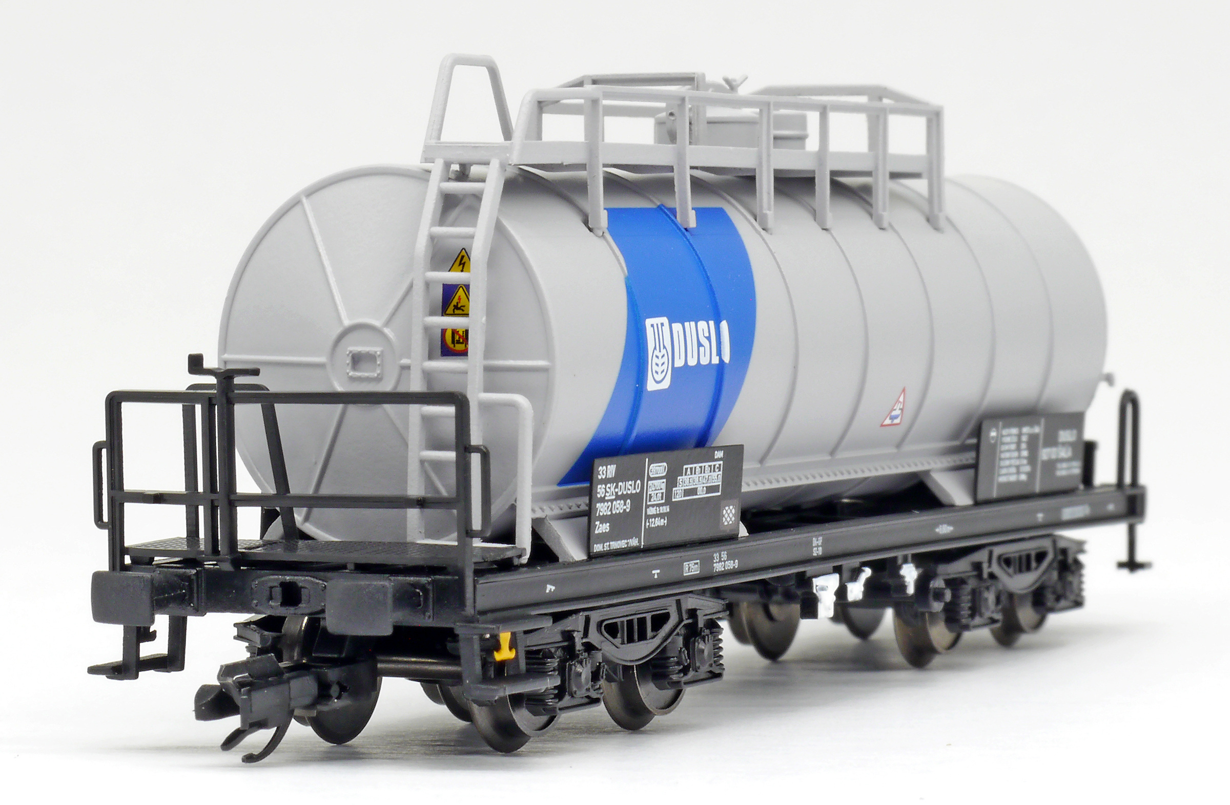 | kotlový vůz šedý s modrým pásem a s logem „DUSLO“ |