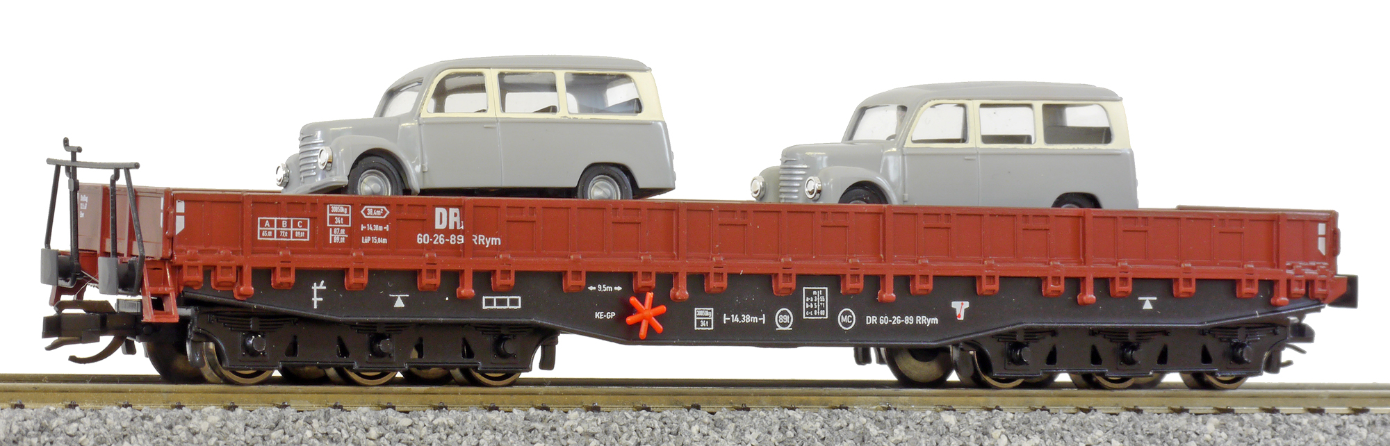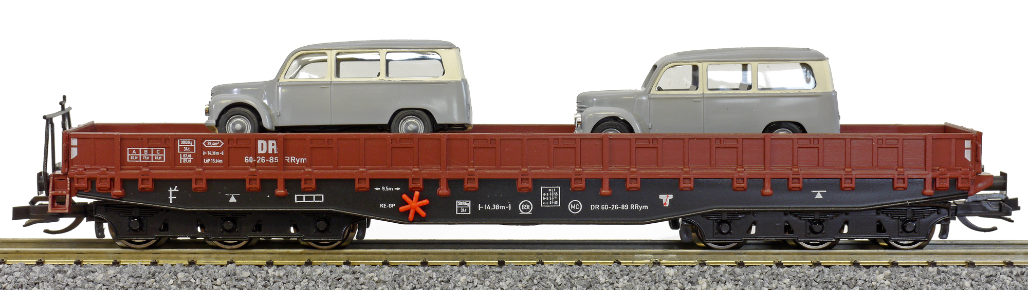 | nízkostěnný vůz červenohnědý s nákladem dvou minibusů Framo |