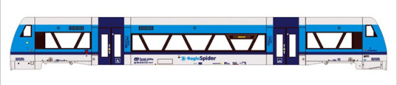 | motorový vůz v barevném schematu „Najbrt“ s logem „RegioSpider“ |