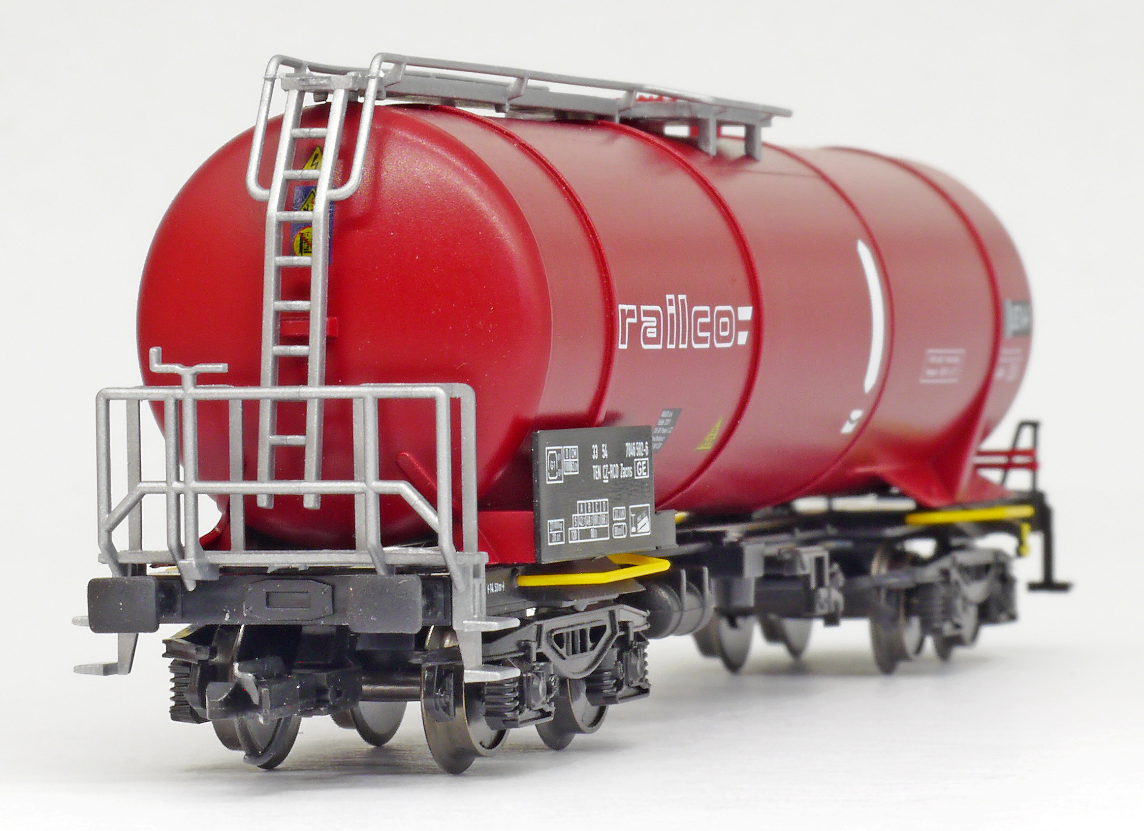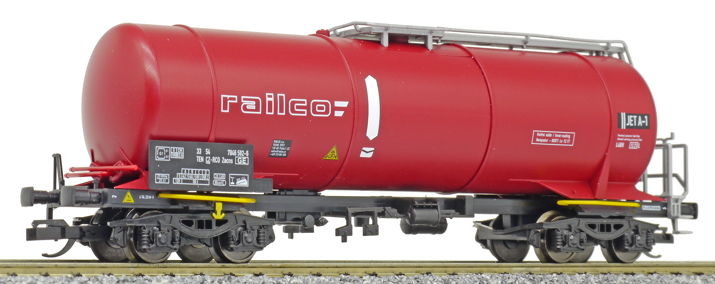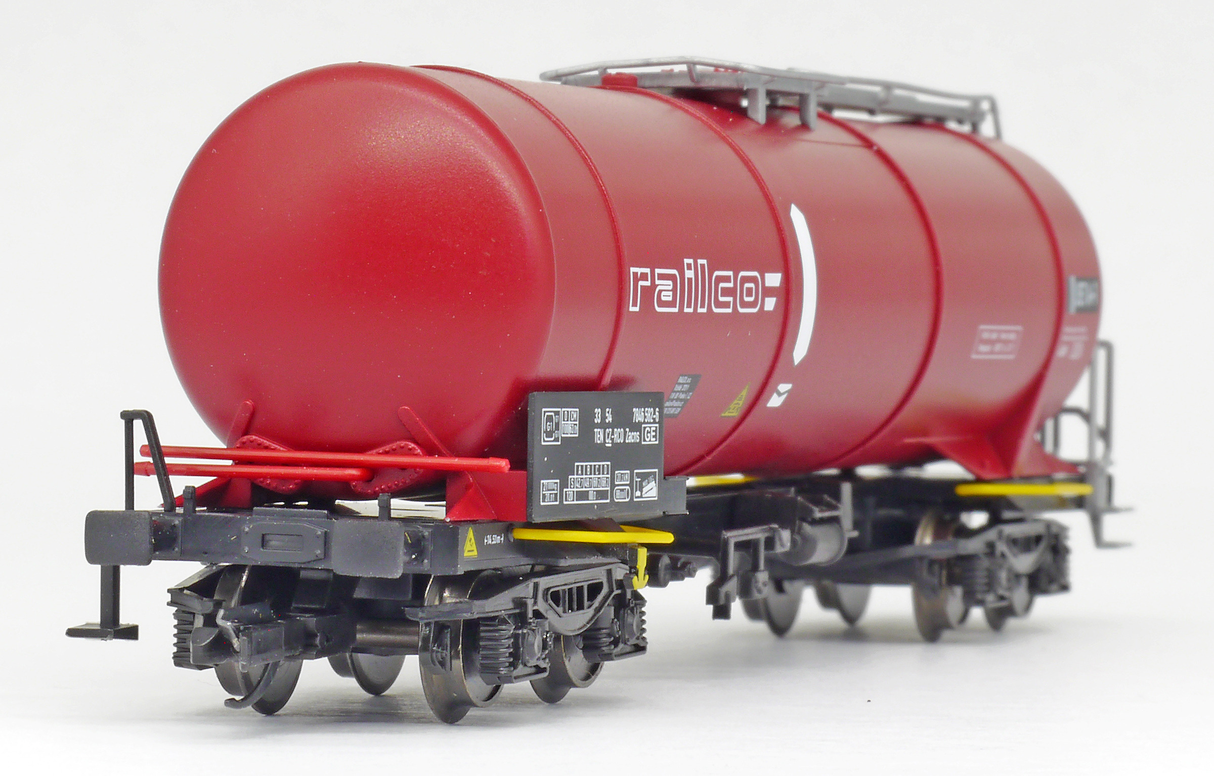 | kotlový vůz tmavě červený s bílými pásy a logem „railco“ |