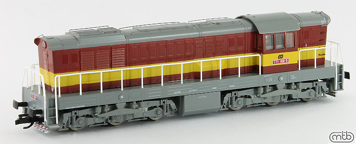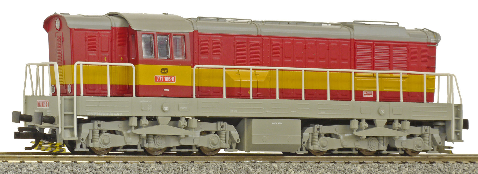 | dieselová lokomotiva červená s výstražným pruhem, šedá střecha, rám a pojezd |
