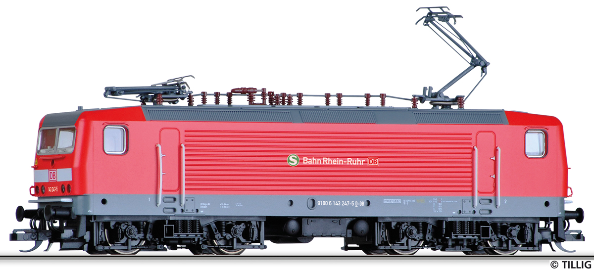 | elektrická lokomotiva červená, šedá střecha a rám, černý pojezd „S-Bahn Rhein-Ruhr“ |