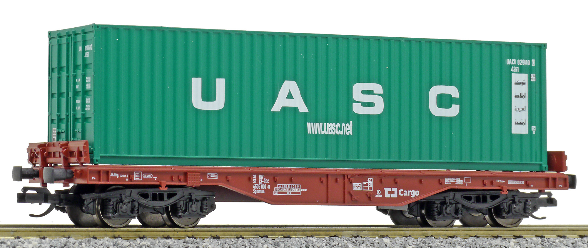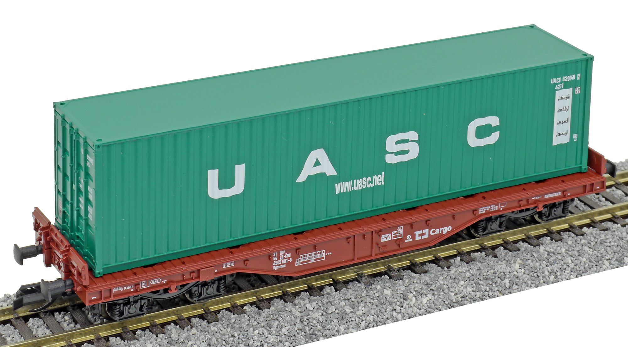 | plošinový nákladní vůz červenohnědý s nákladem 40' kontejneru „UACS“ |