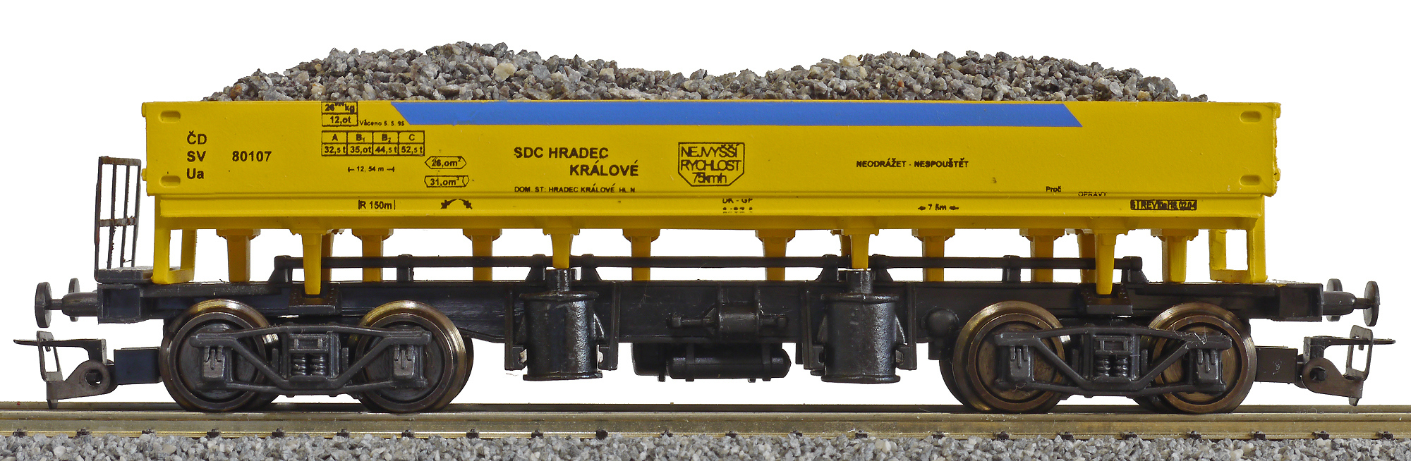 Popis   nákladní vůz oboustranně výsypný žlutý s černým pojezdem a s nákladem