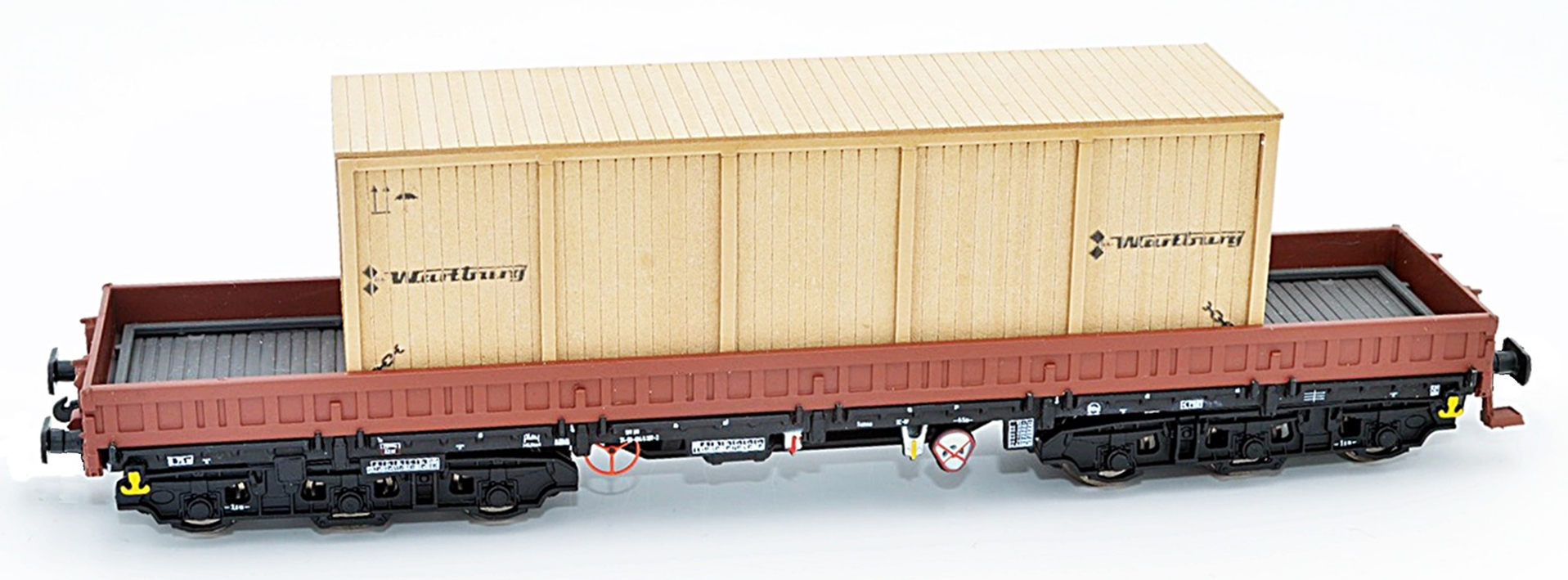 | nízkostěnný nákladní vůz červenohnědý s černým rámem a s nákladem bedny „Wartburg” |