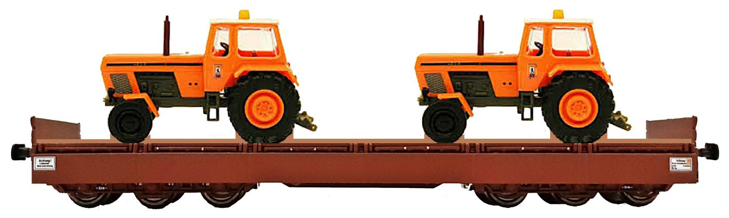 Popis   nízkostěnný nákladní vůz červenohnědý s nákladem dvou traktorů ZT300