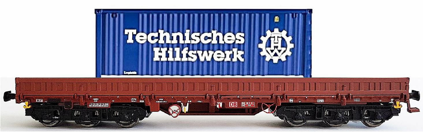 Popis   nízkostěnných nákladní vůz červenohnědý s kontejnerem „Technisches Hilfswerk”