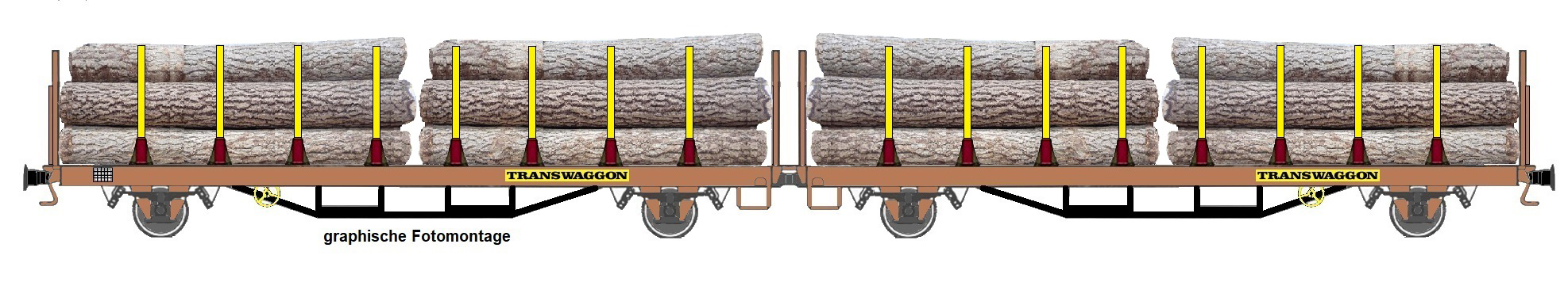 dvojdílný plošinový nákladní vůz červenohnědý s nákladem dřeva
