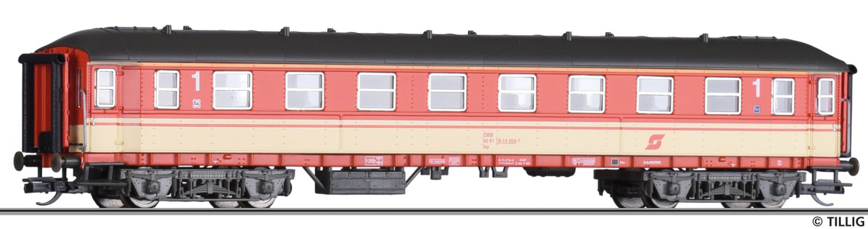 | osobní vůz červený s krémovým pruhem, šedá střecha, 1. tř. |