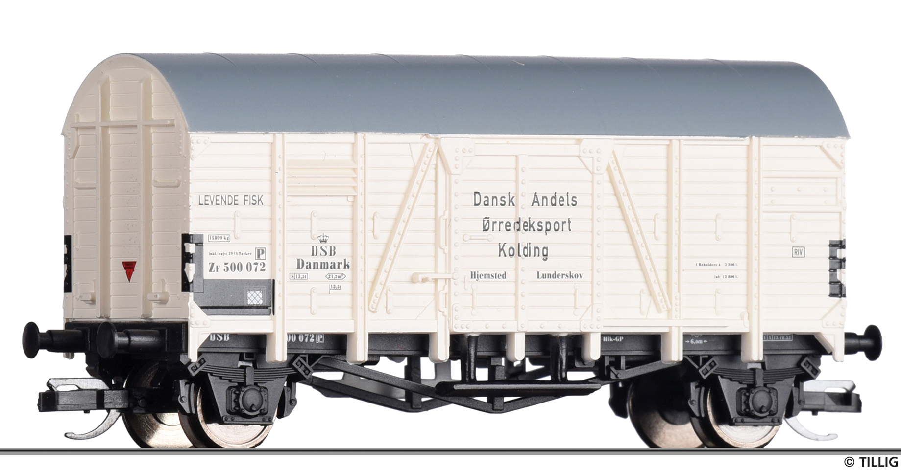 krytý nákladní vůz bílý s šedou střechou „Dansk Andels Ørredeksport Kolding“