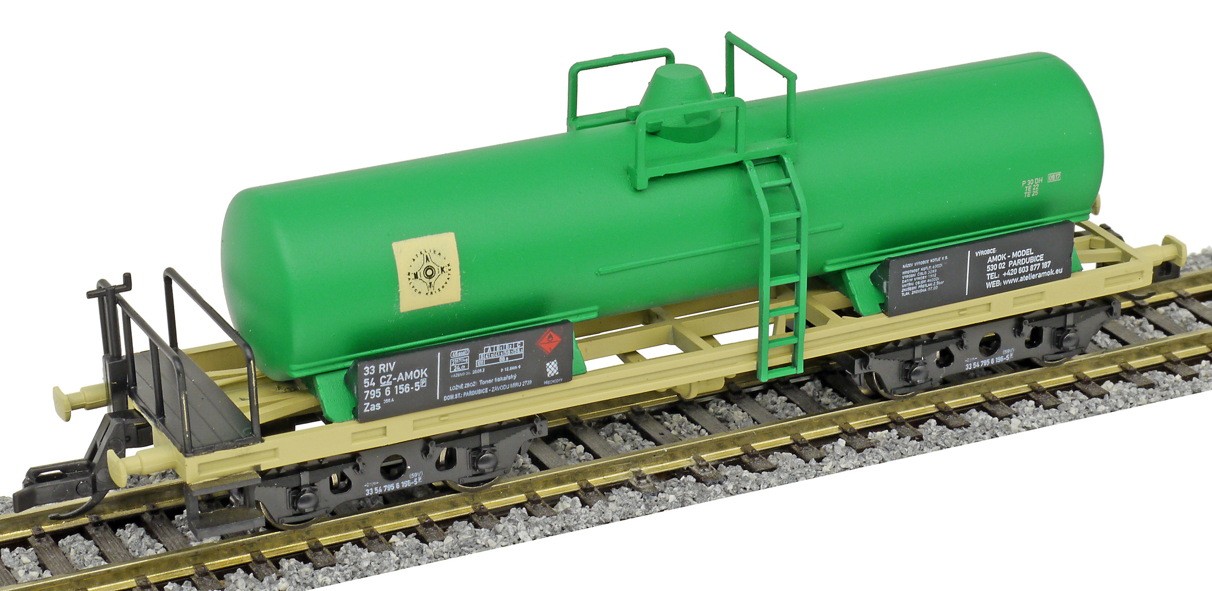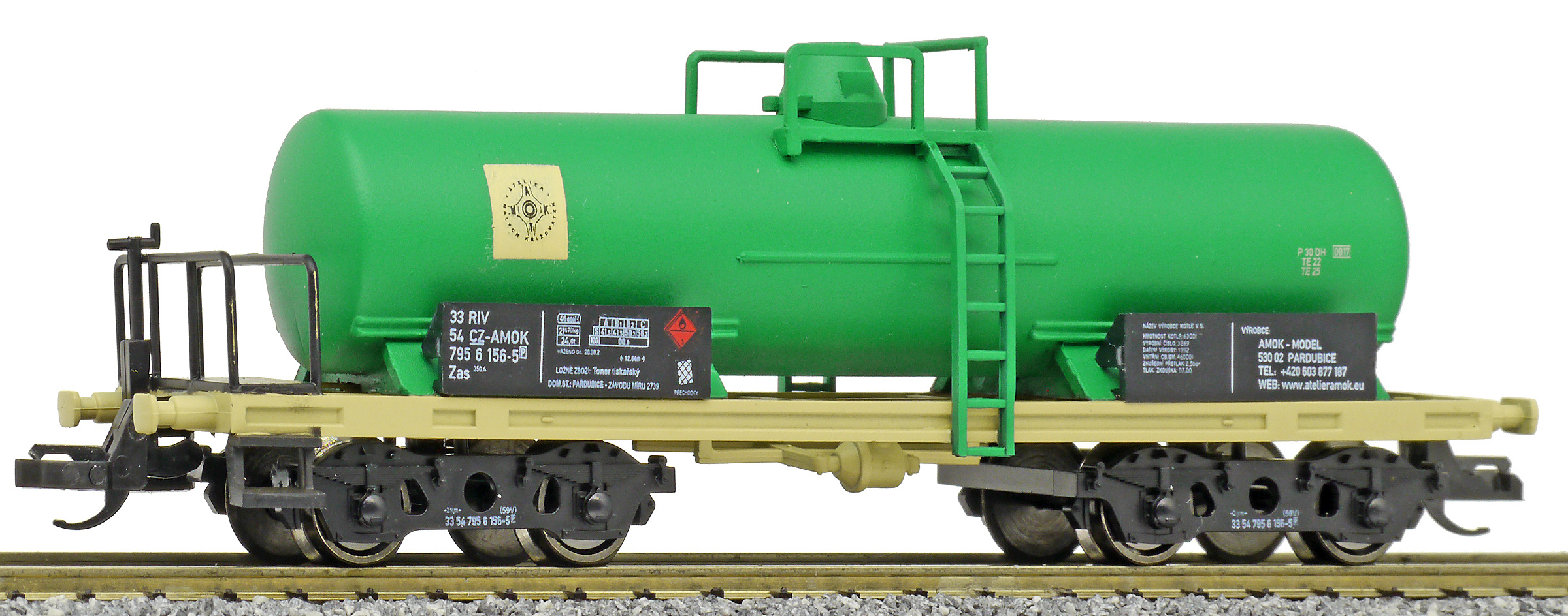 | kotlový vůz zelený s brzdařskou plošinou „AMOK“ |
