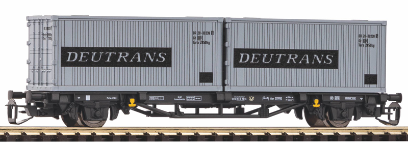 | plošinový vůz černý s nákladem 2x20' kontejneru „Deutrans“ |