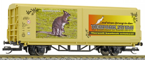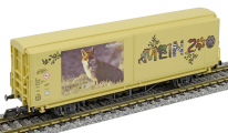 | krytý nákladní vůz s posuvnými stěnami a s reklamním potiskem „Mein Zoo” |