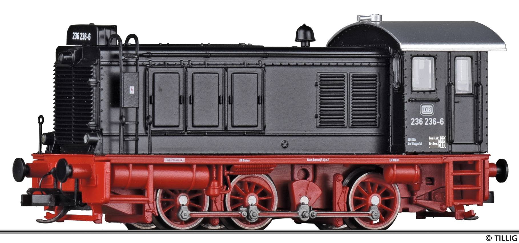 | dieselová lokomotiva černá s šedou střechou, červený rám a pojezd |