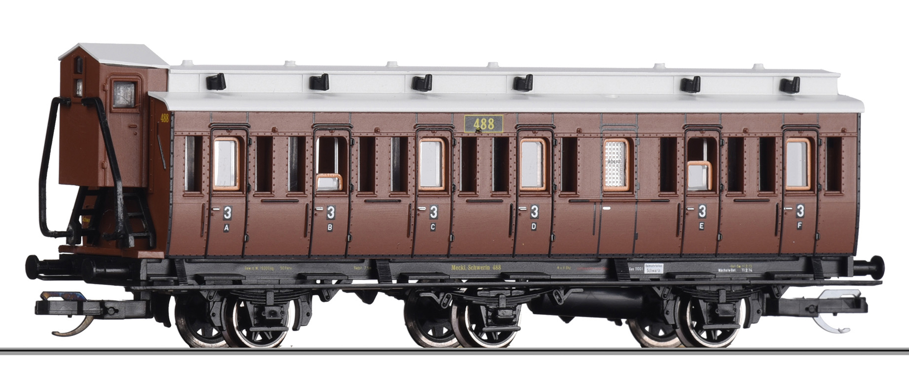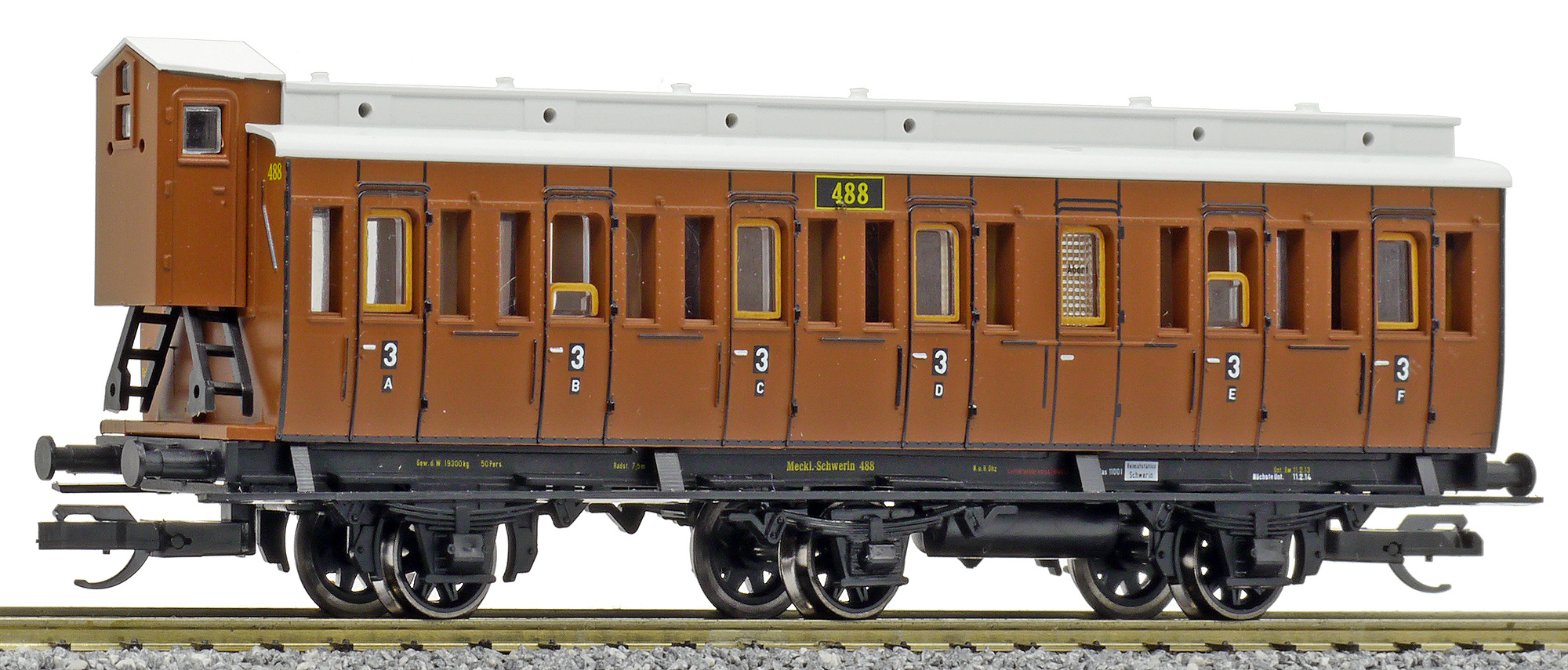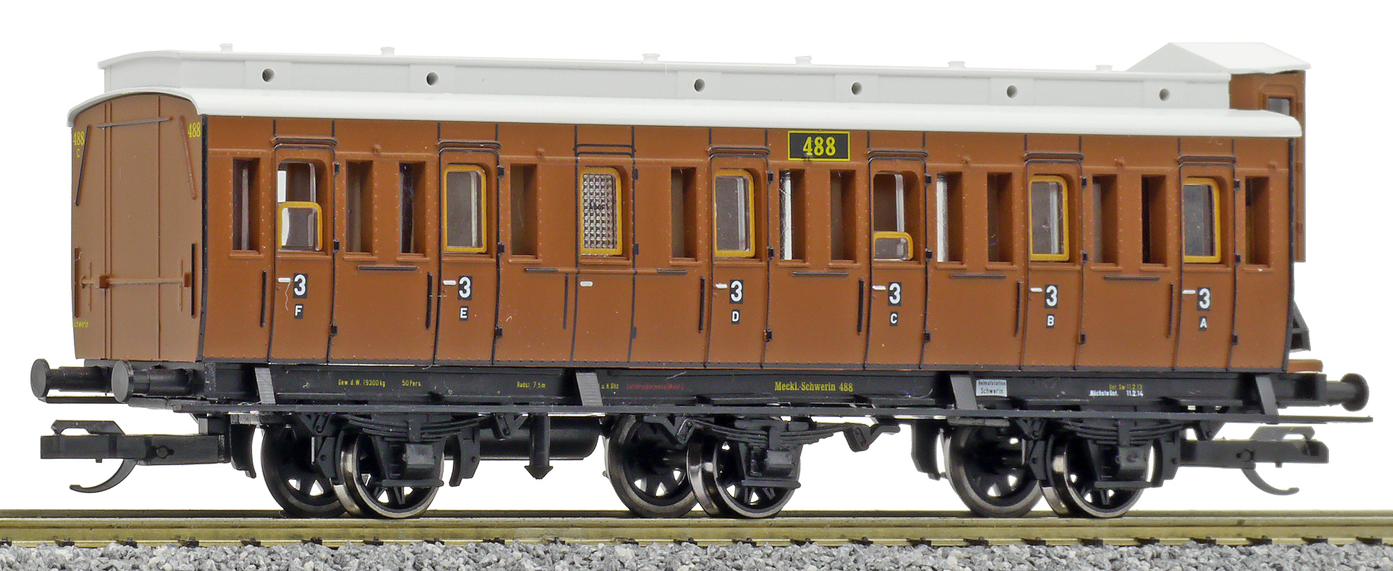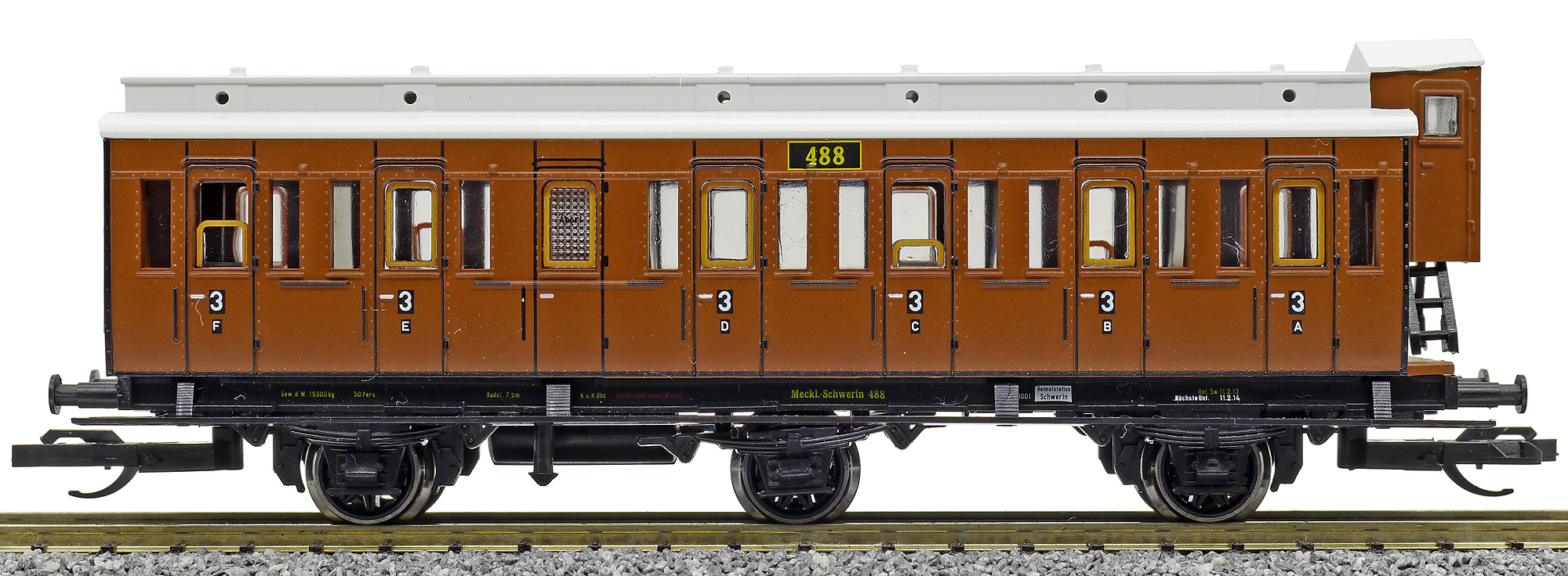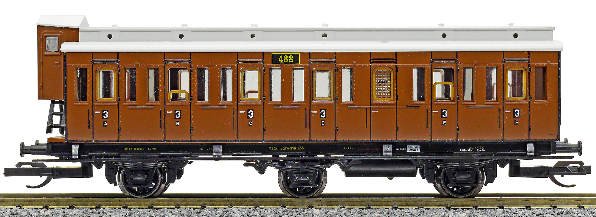 | oddílový osobní vůz červenohnědý se světle šedou střechou 3. tř. „Mecklenburgischer Reisezug 2“ |