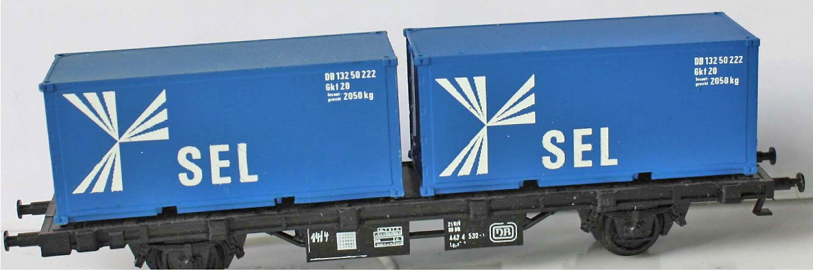 | plošinový nákladní vůz černý se dvěma 20' kontejnery „SEL“ |