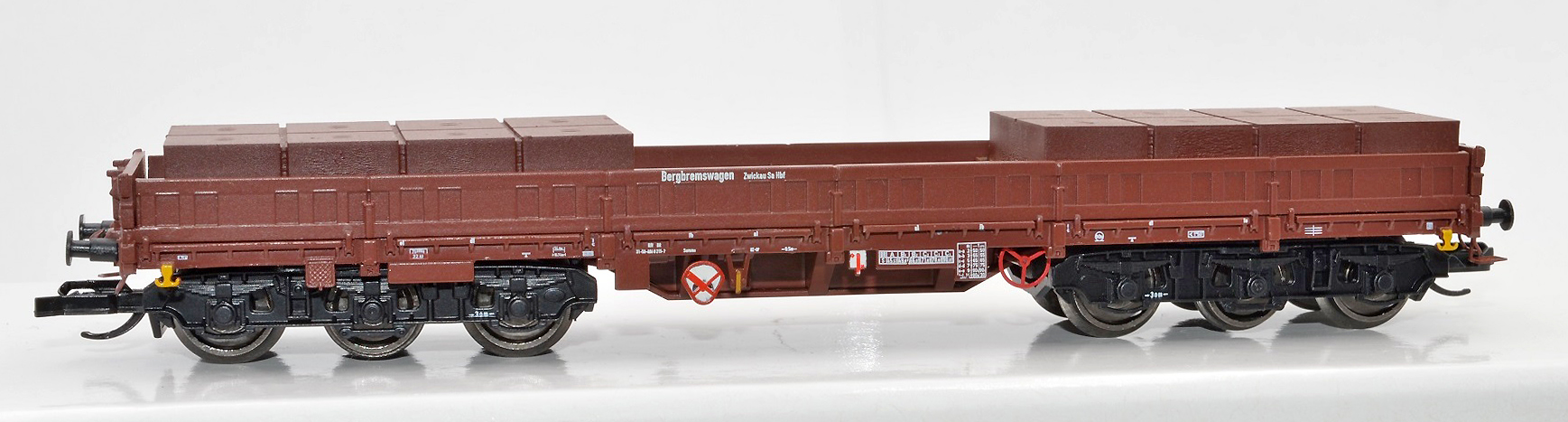 | brzdový nízkostěnný nákladní vůz červenohnědý ložený balastem |