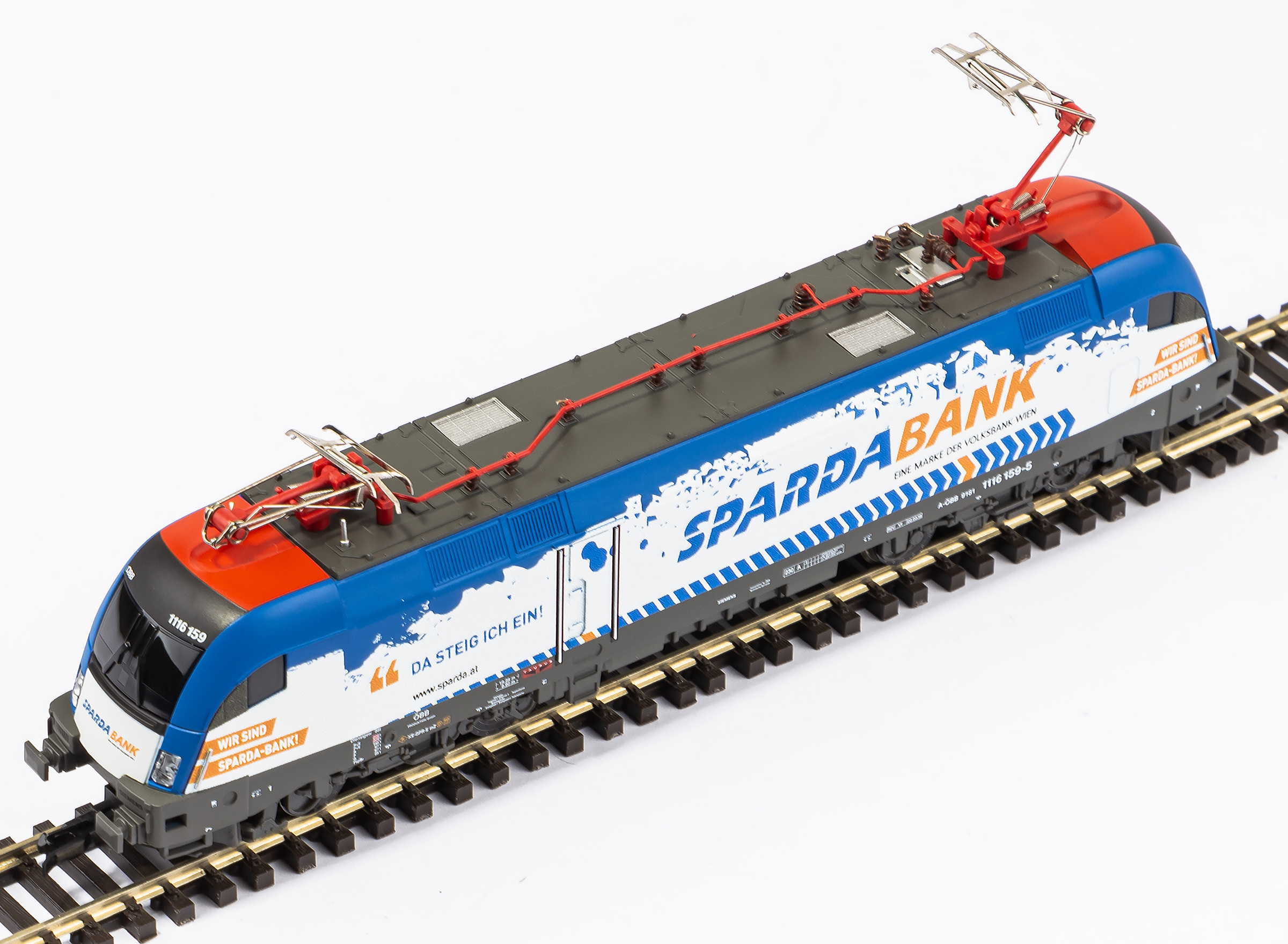 | elektrická lokomotiva modrá-bílá s reklamním potiskem „SPARDA-BANK“ |