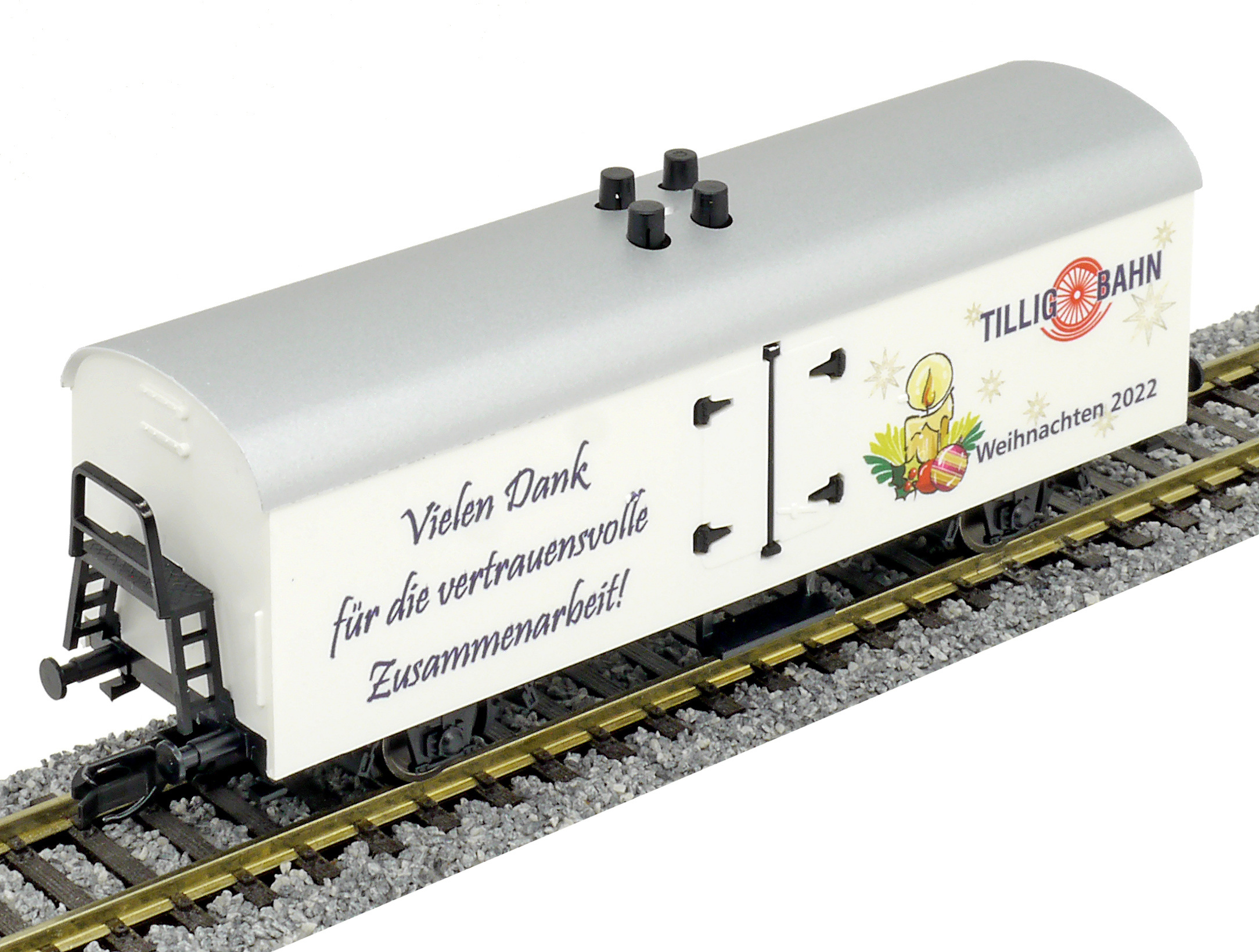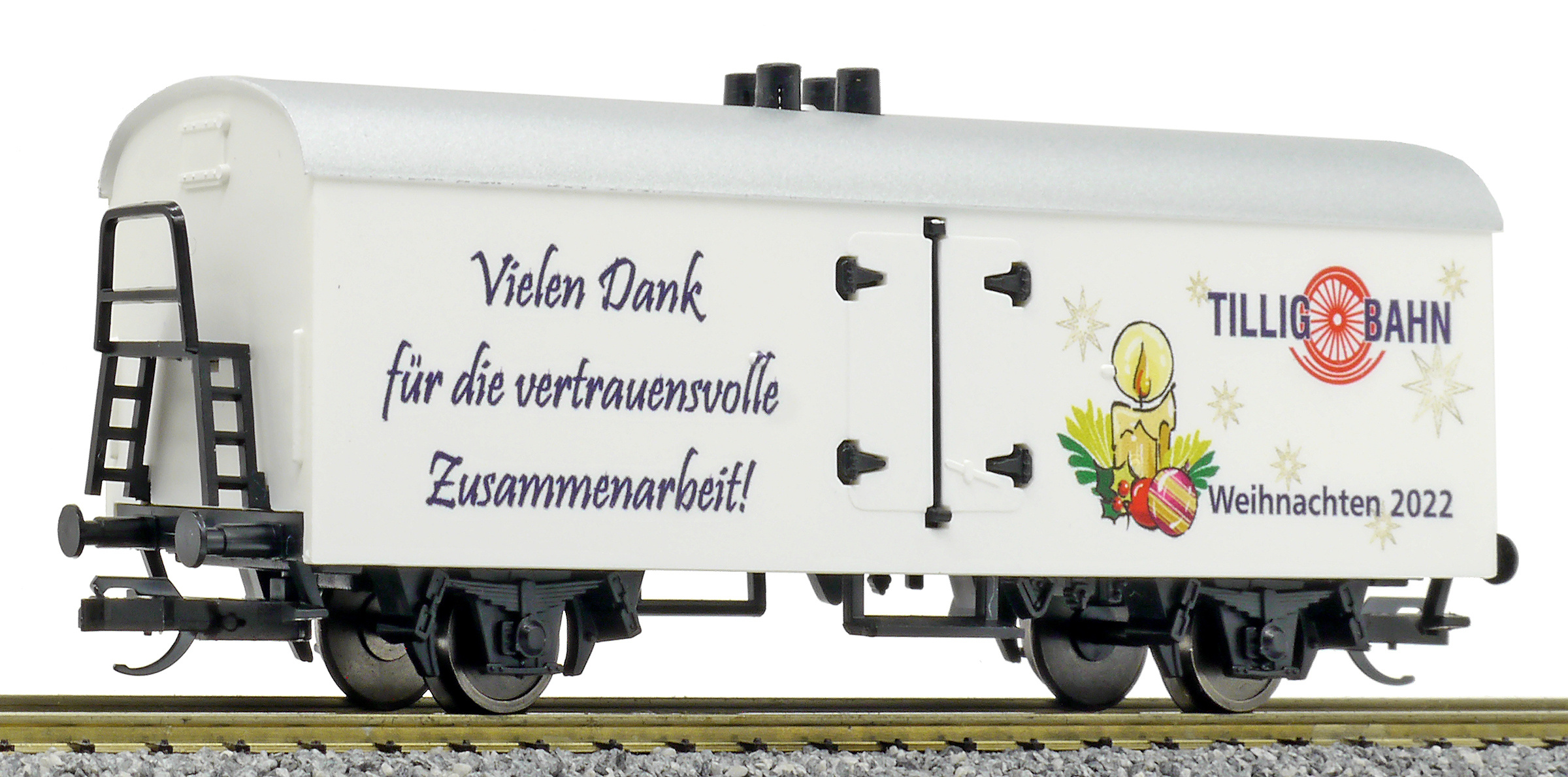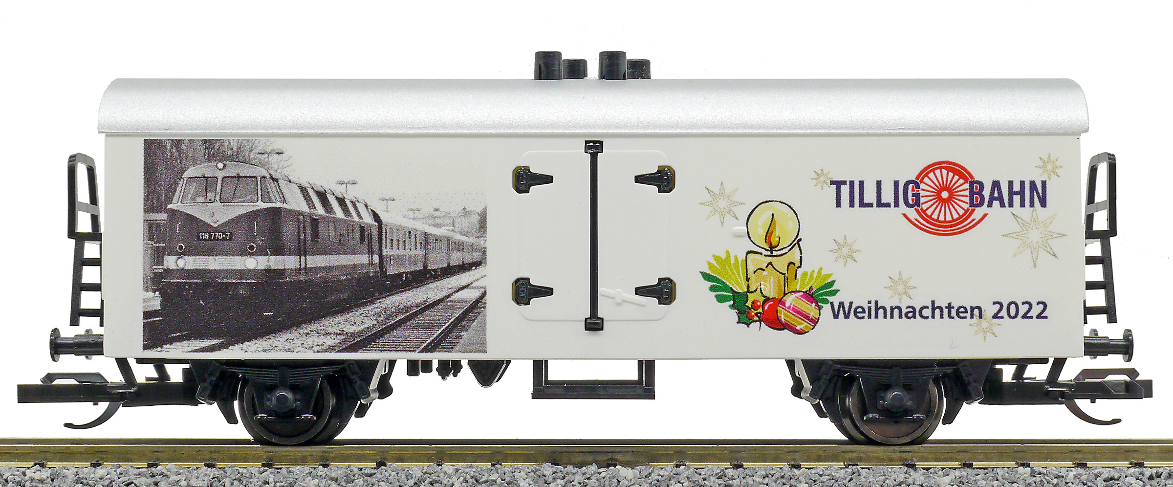 | chladící vůz bílý s šedou střechou a s reklamním potiskem „Weinachten 2022“ |