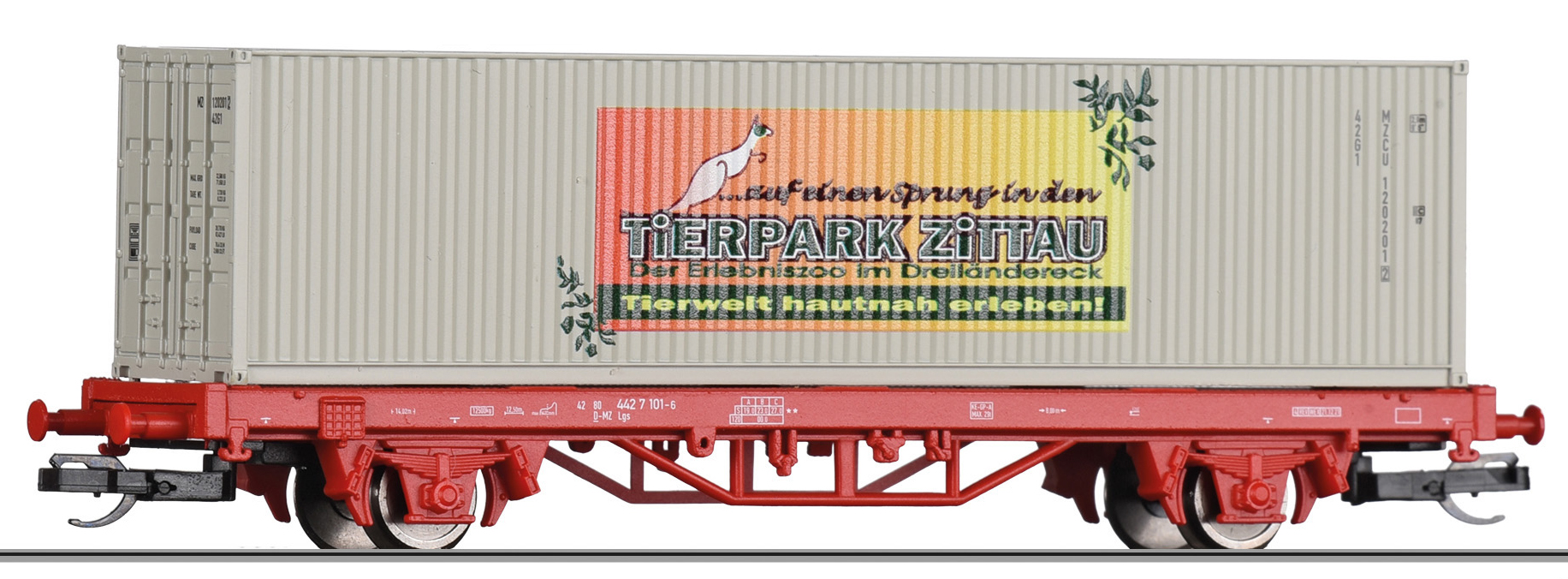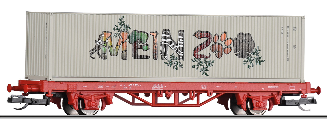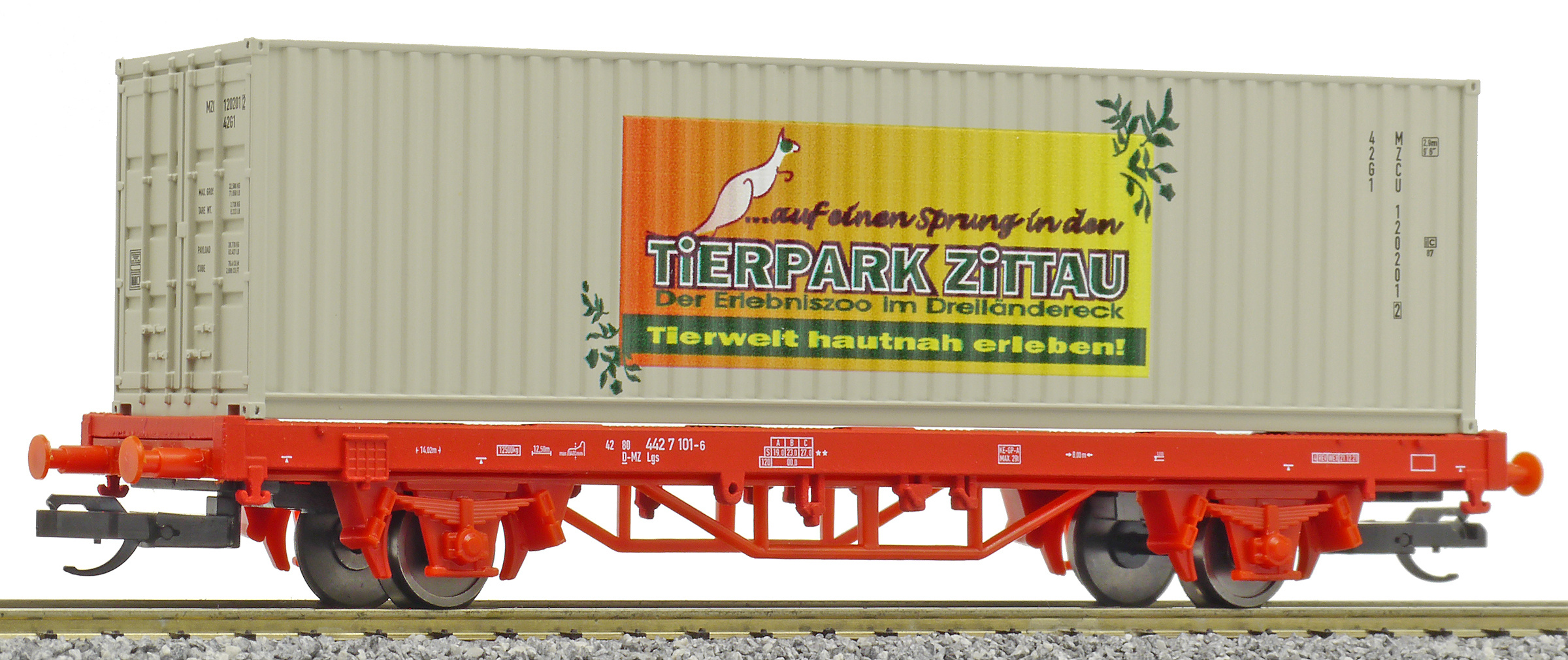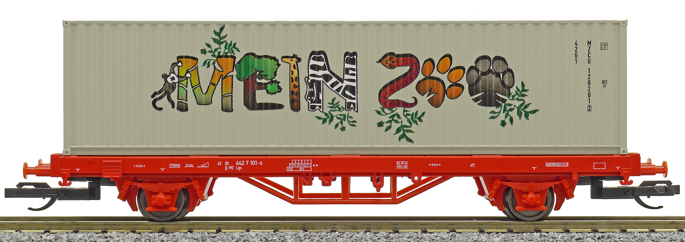 | plošinový vůz modrý s nákladem 1x 40' kontejneru „MainZoo“ |