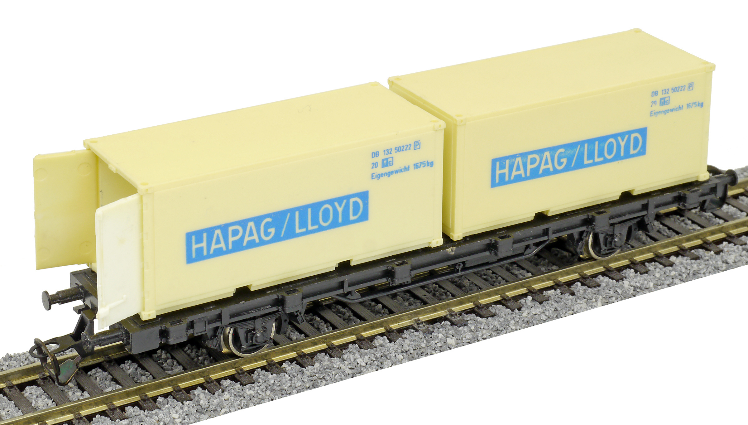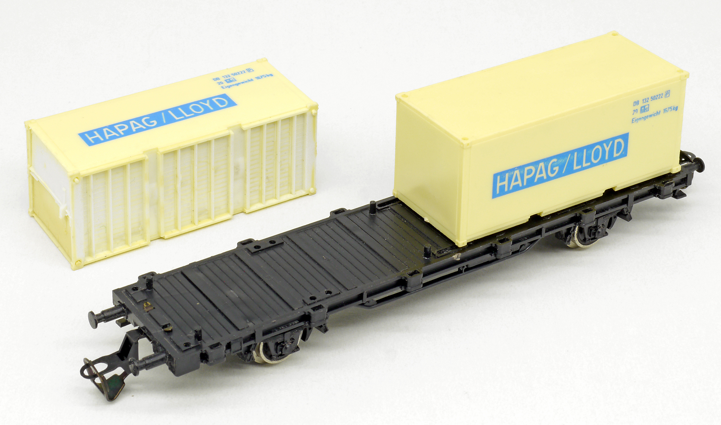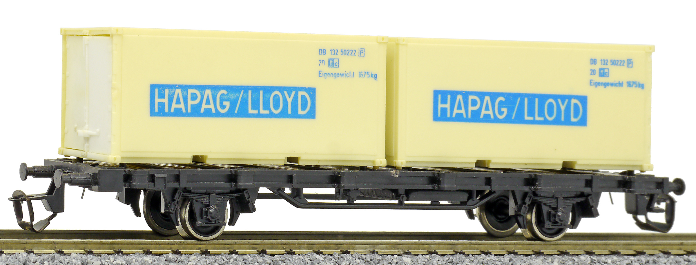 | nákladní plošinový vůz černý se dvěma 20' kontejnery „HAPAG/LLOYD“ |