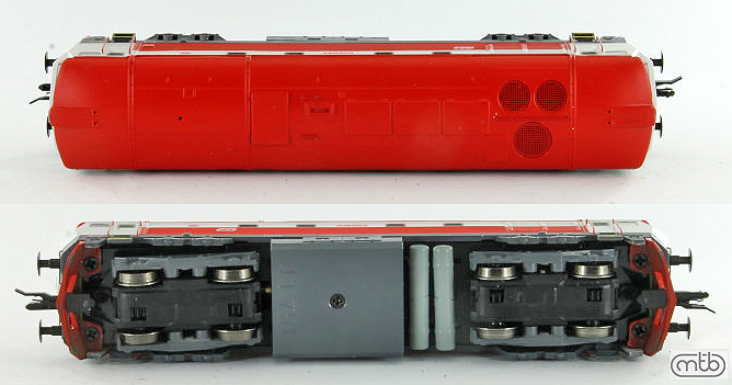 Popis   dieselová lokomotiva červená-bílá, červená střecha, černý rám a pojezd