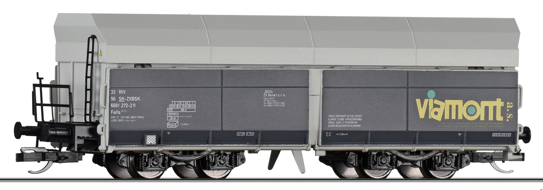 | nákladní samovýsypný vůz šedý s logem „viamont“ |