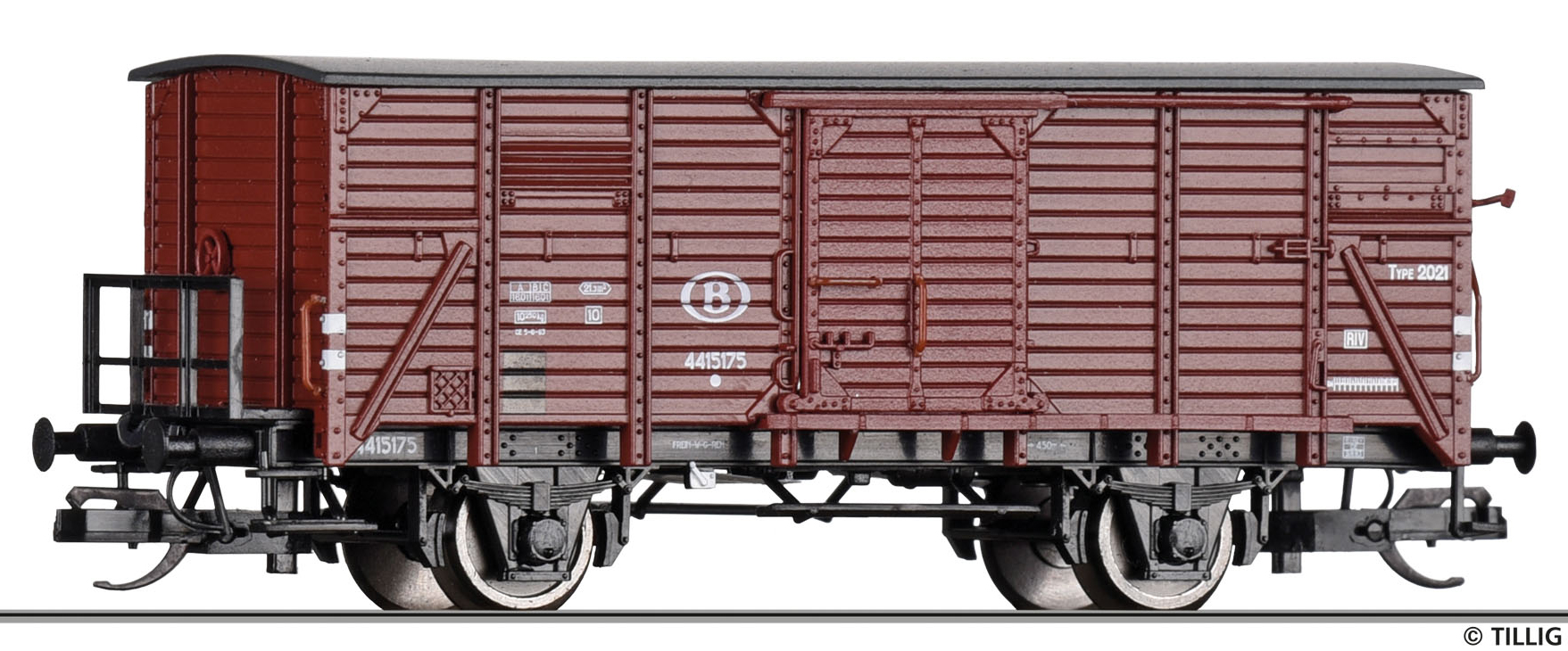 krytý nákladní vůz červenohnědý s černou střechou a s brzdařskou plošinou