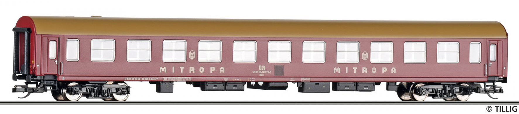 | lehátkový vůz vínově červený s olivovou střechou „Mitropa“ |
