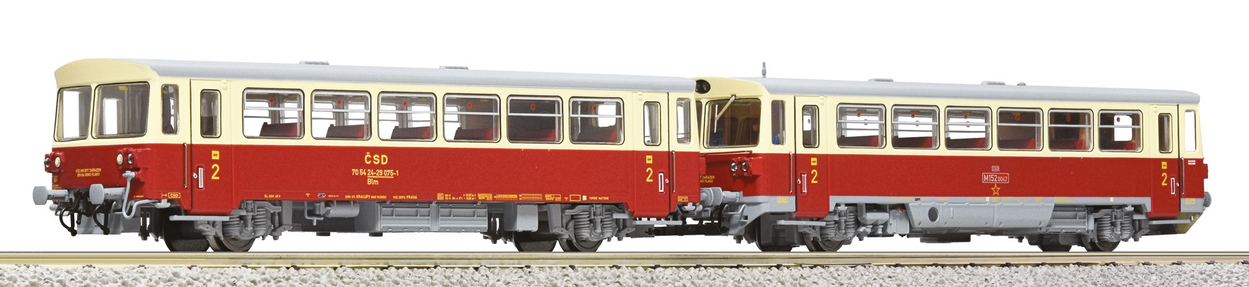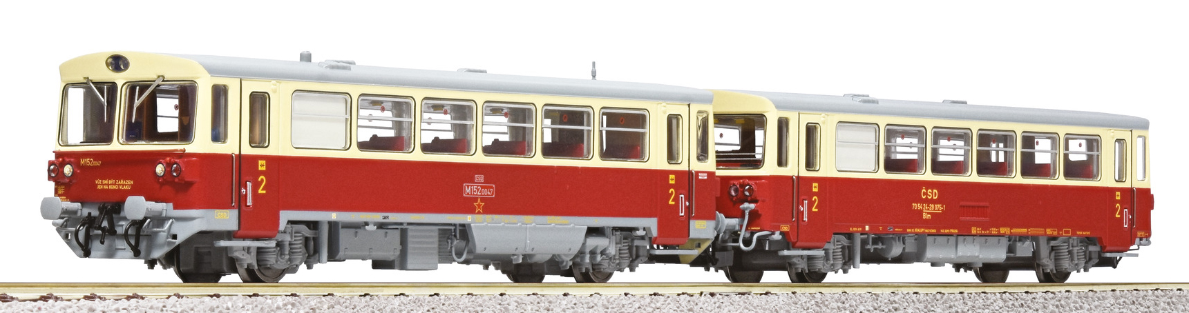| motorový vůz s přípojným vozem v barvách červený-slonová kost s šedou střechou |