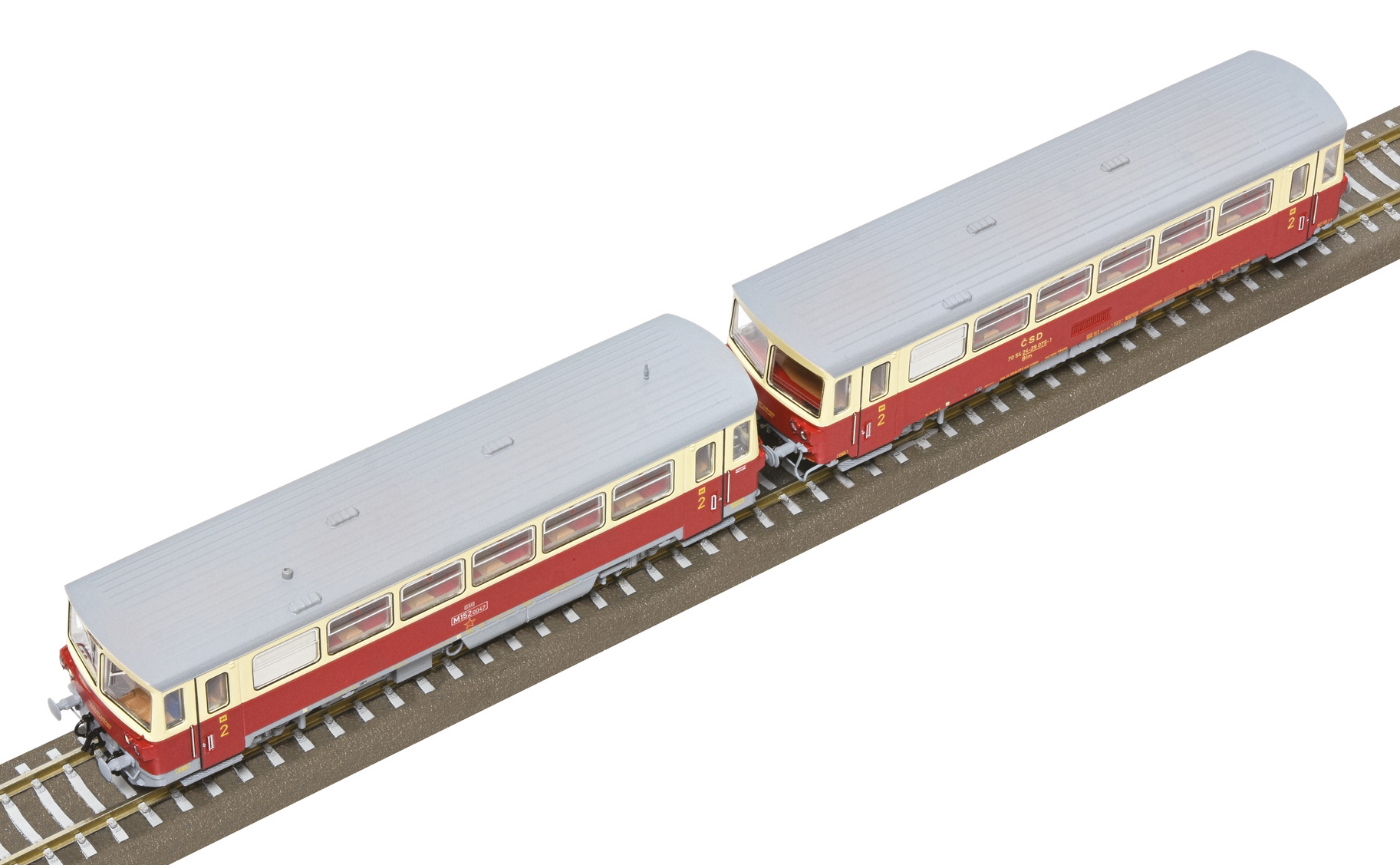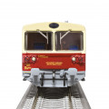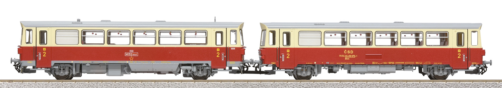 | motorový vůz s přípojným vozem v barvách červený-slonová kost s šedou střechou |