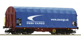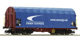 | plošinový vůz hnědý s odsuvnou modrou plachtou „ZSSK CARGO“ |