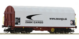 | plošinový vůz hnědý s odsuvnou šedou plachtou „ZSSK CARGO“ |