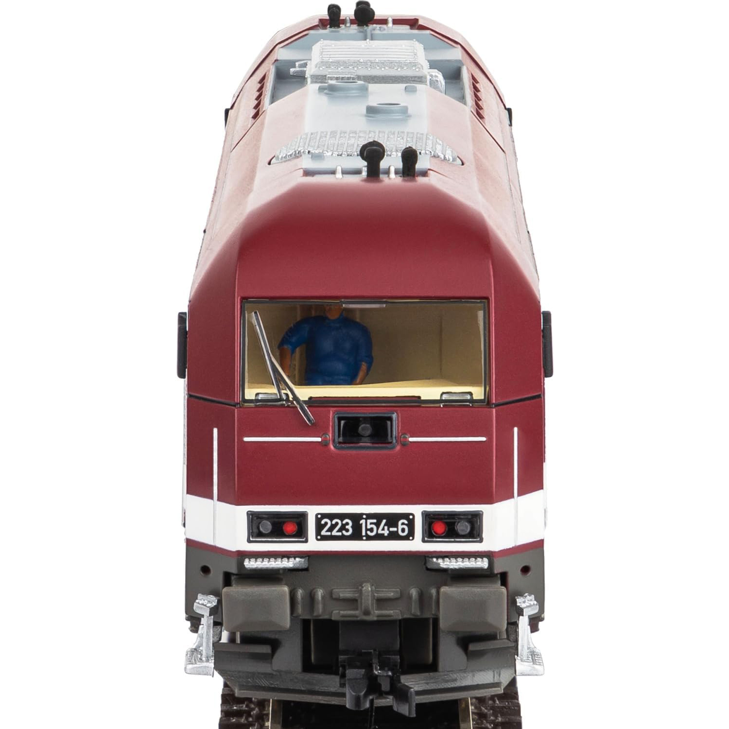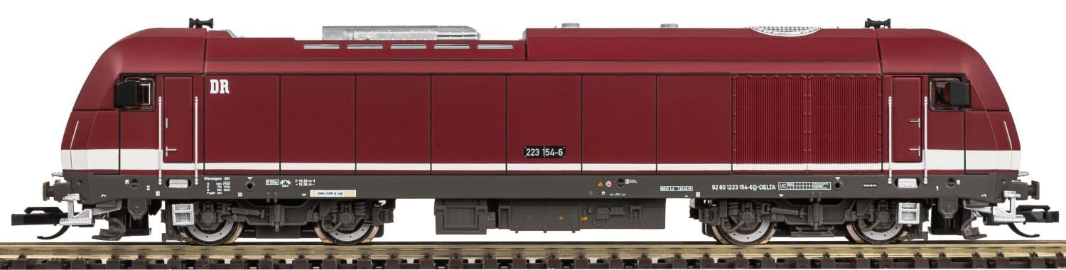 | dieselová lokomotiva vínově červená, krémový proužek, černý rám a pojezd |