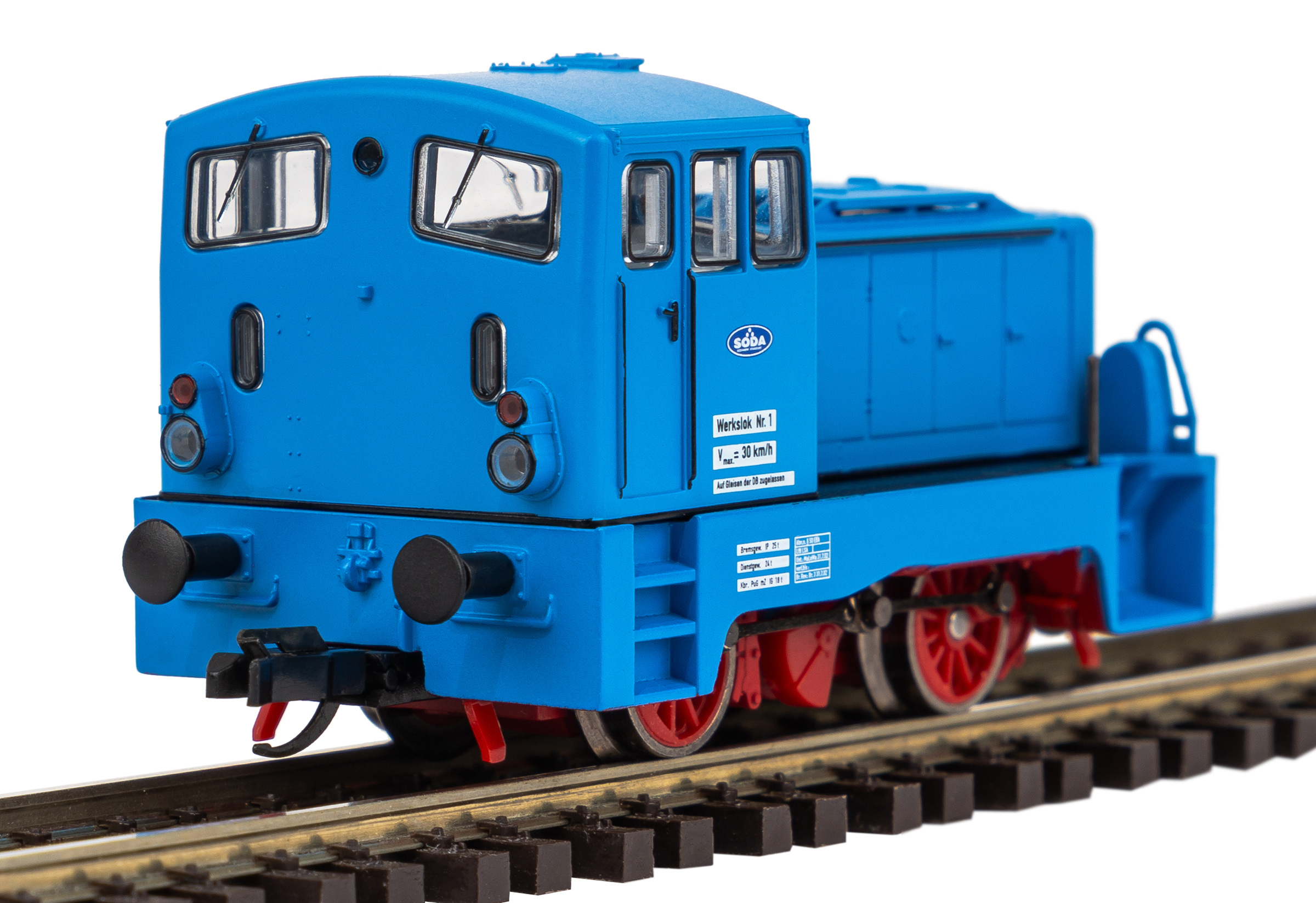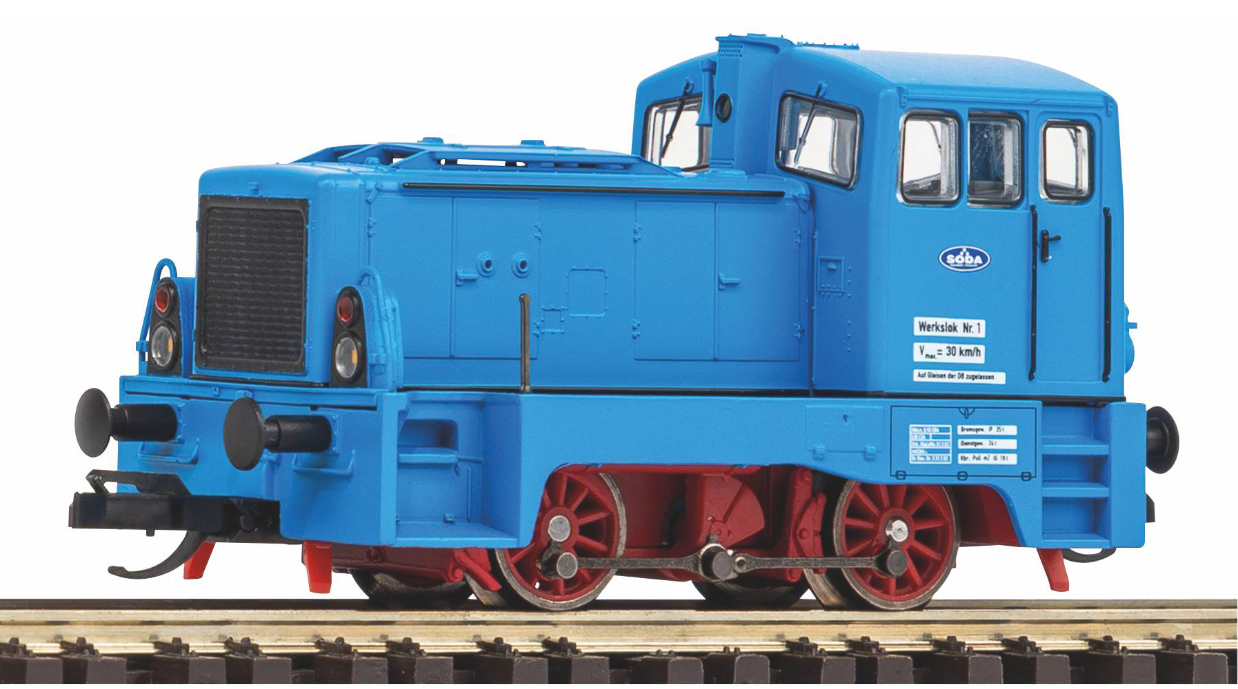 | dieselová lokomotiva modrá s červeným pojezdem „SODA“ |