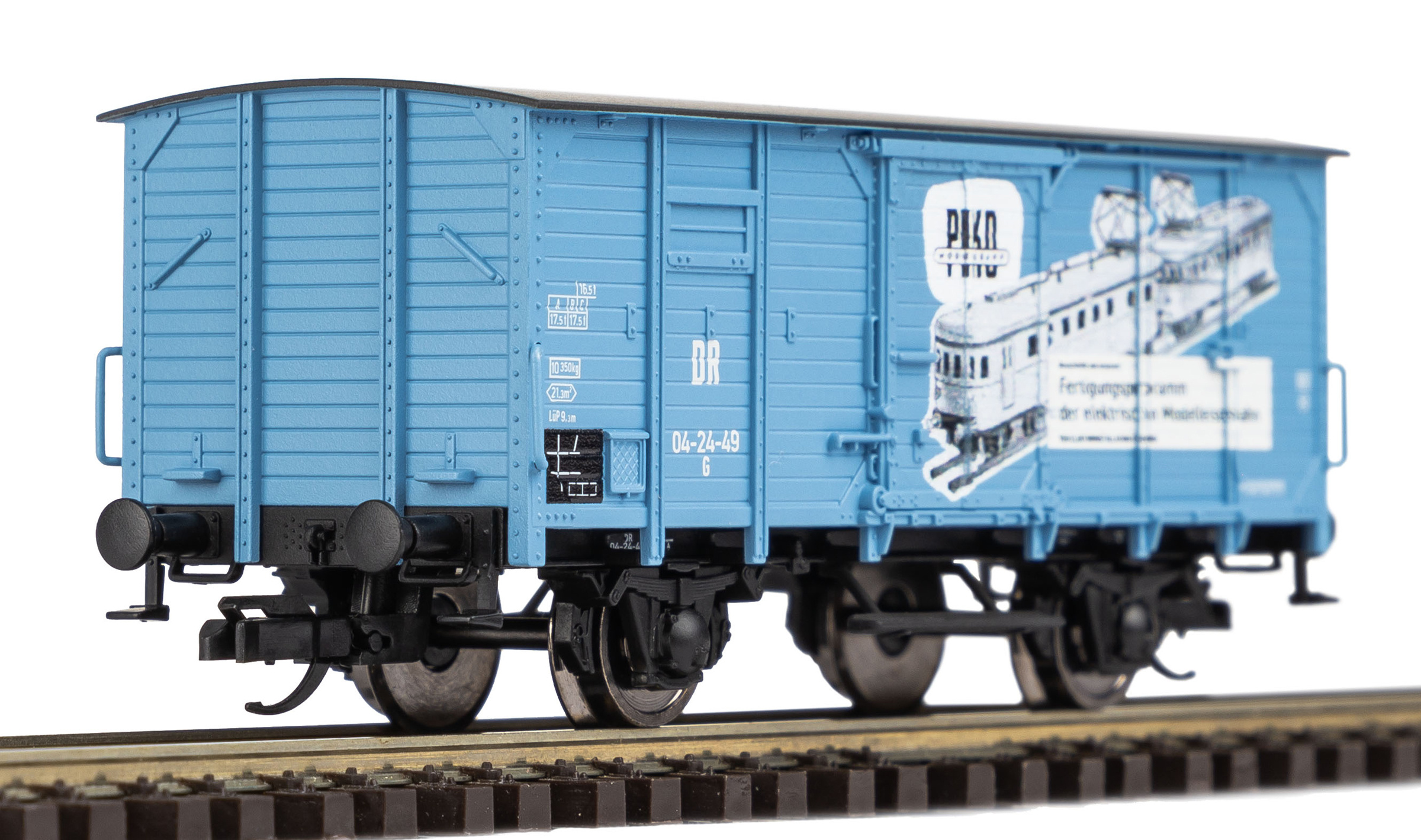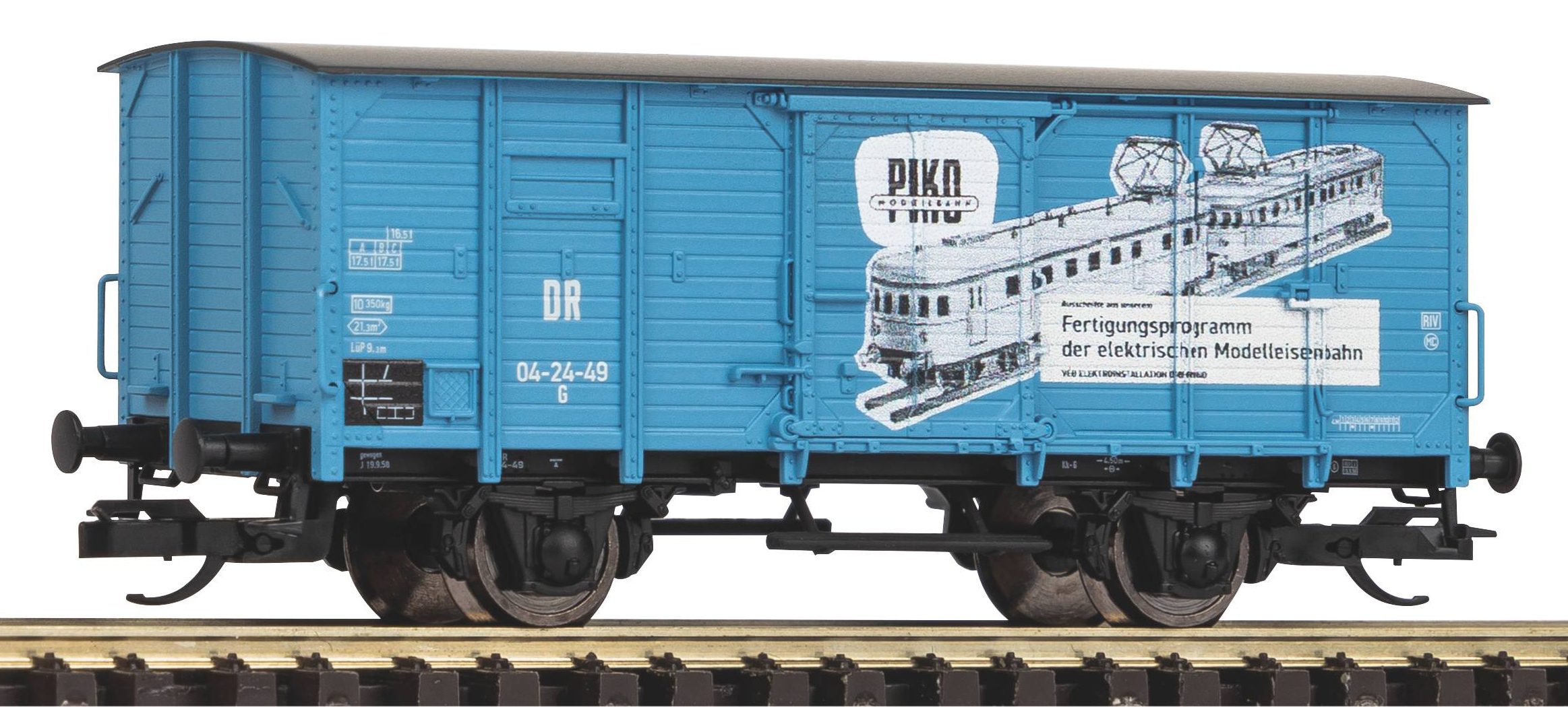 Popis   krytý nákladní vůz modrý s černou střechou a s reklamním potiskem „VEB PIKO“