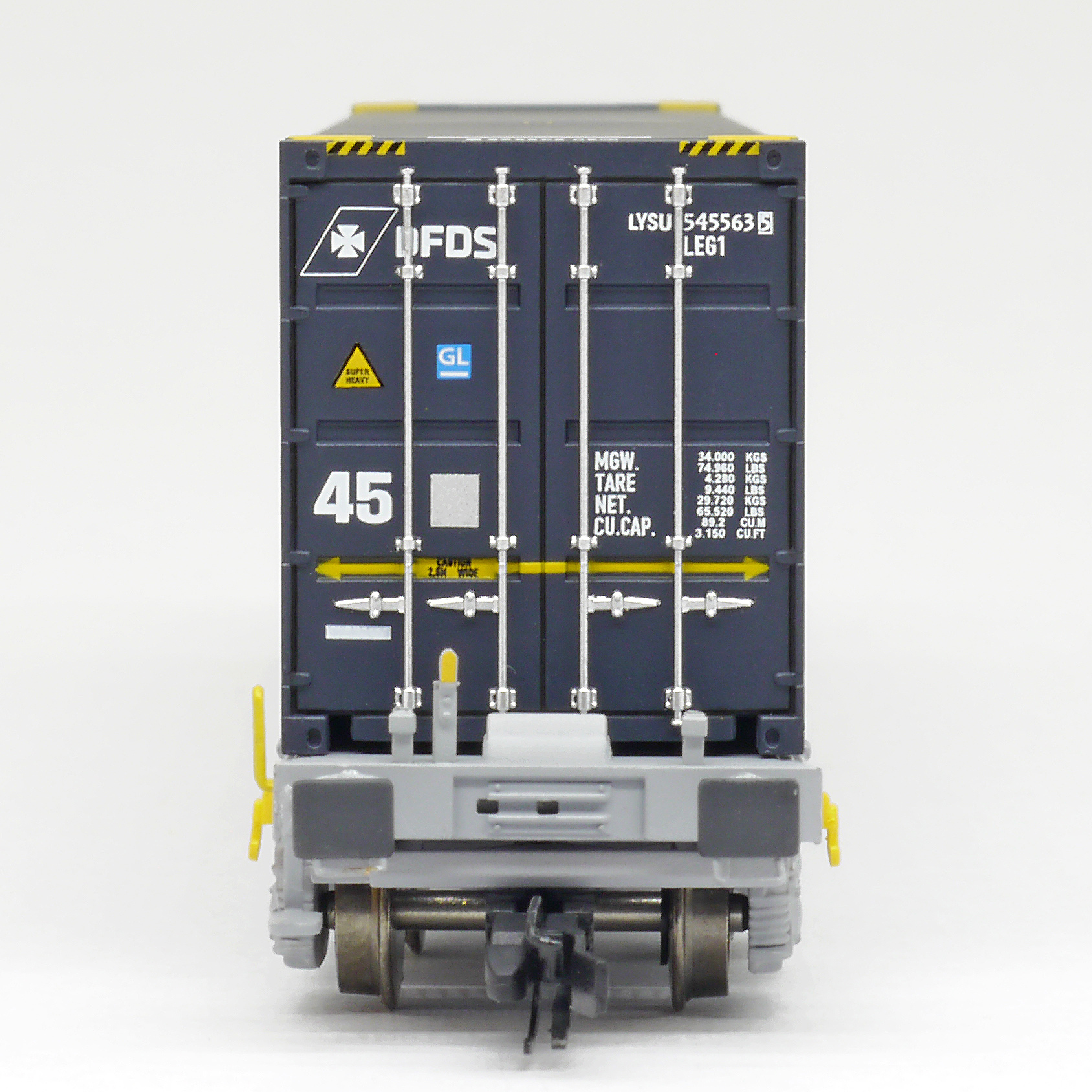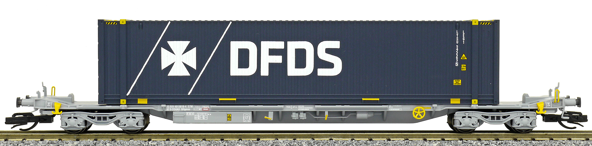 | kontejnerový vůz „IFA” šedý ložený 45' kontejnerem „DFDS” |