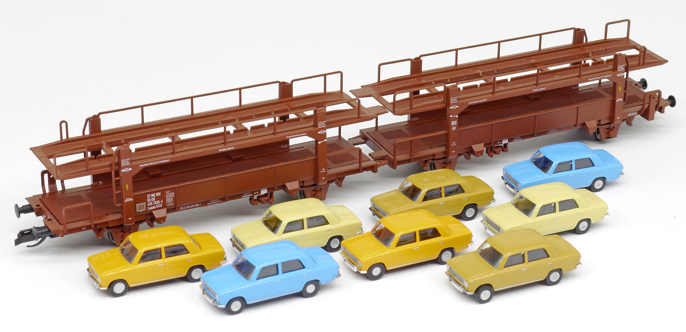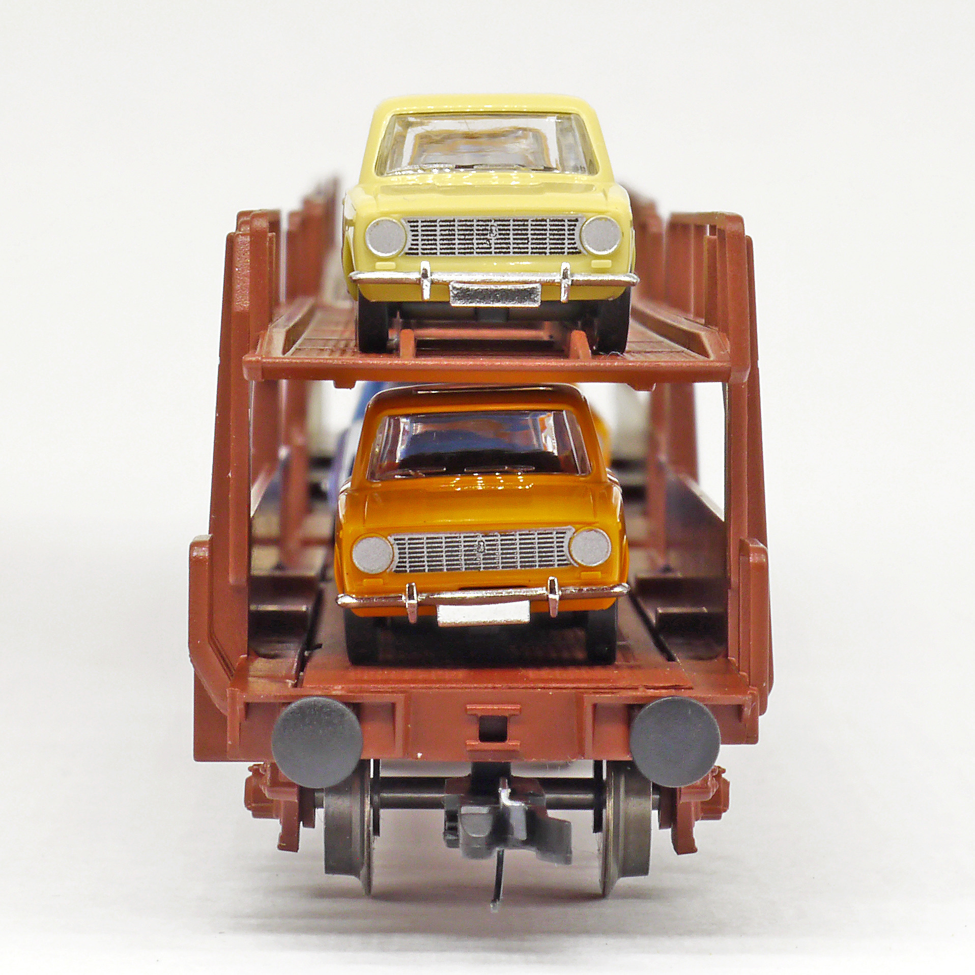 | nákladní vůz na přepravu aut červenohnědý ložený 8x osobními vozy Lada 1200 |