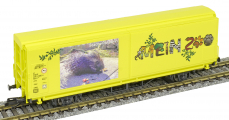 | krytý nákladní vůz s posuvnými stěnami a s reklamním potiskem „Mein Zoo” |