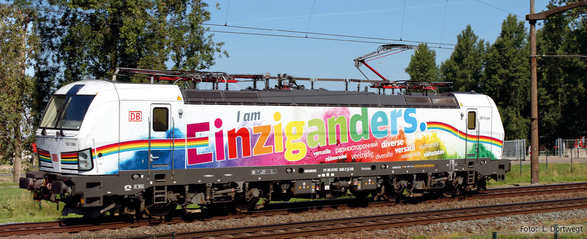 | elektrická lokomotiva s reklamním potiskem „I am Einziganders“ |