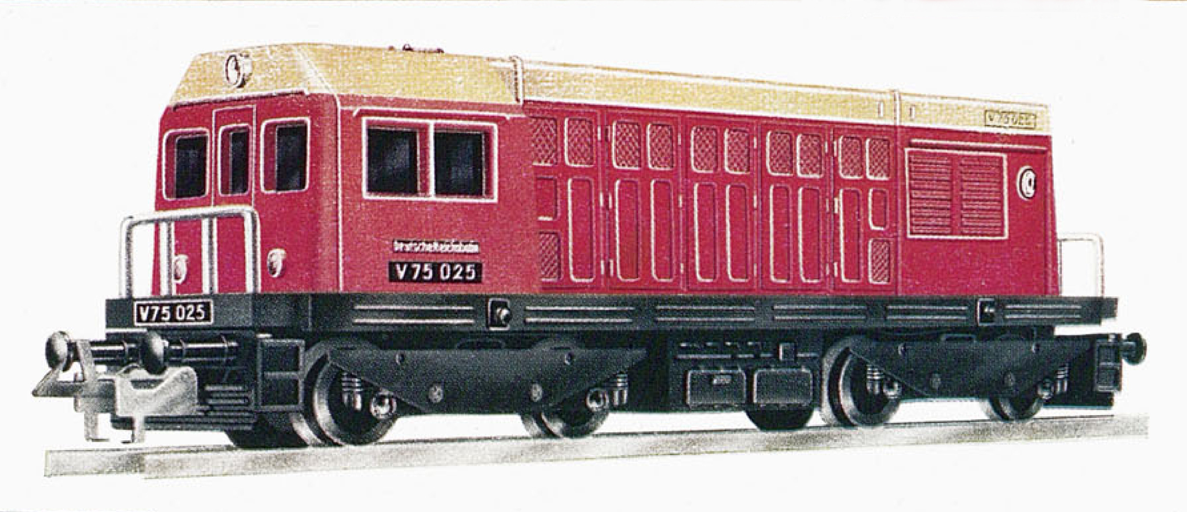 | dieselová lokomotiva červená-slonová kost, černý rám a pojezd |