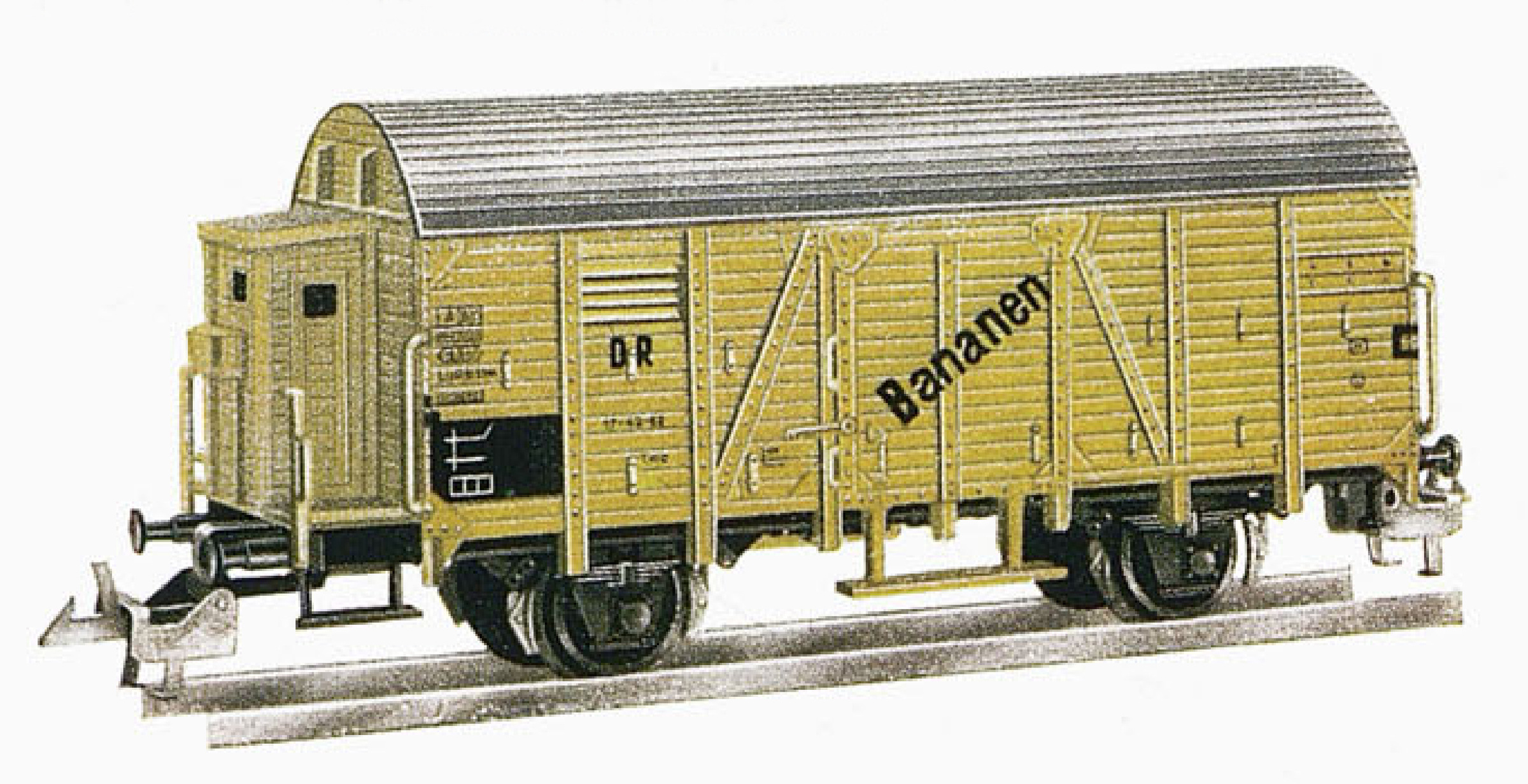 nákladní chladící vůz žlutý s černou střechou „Bananen“ a s brzdařskou budkou