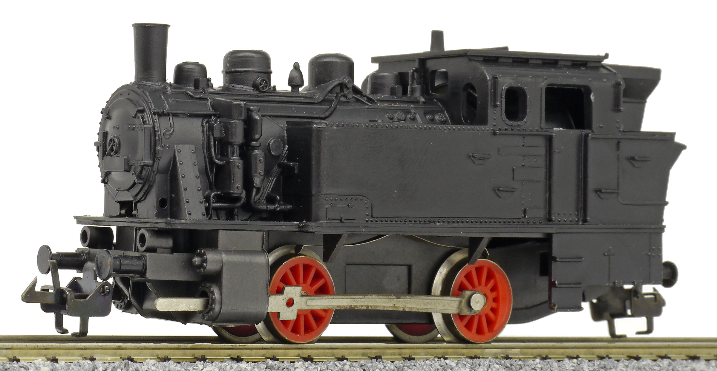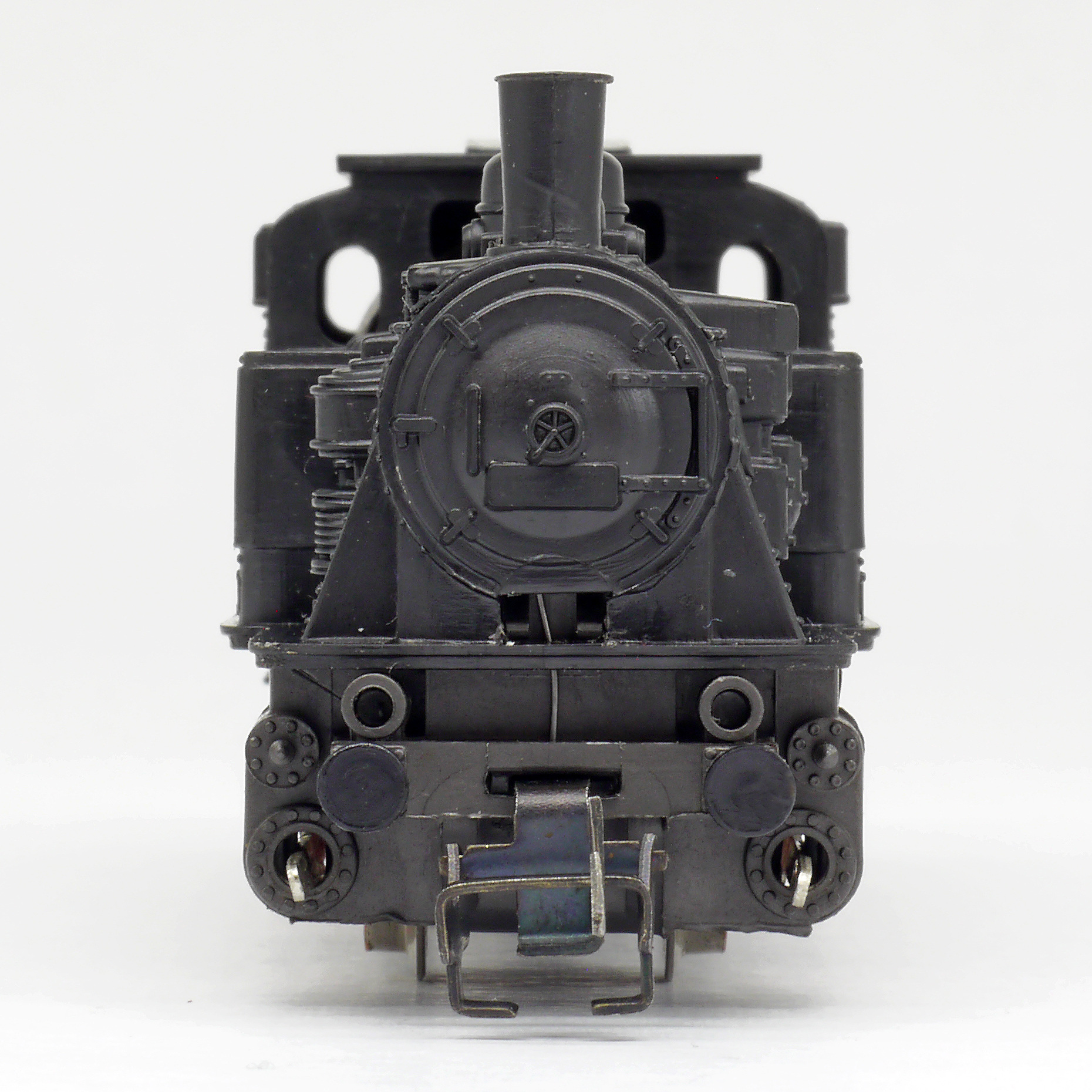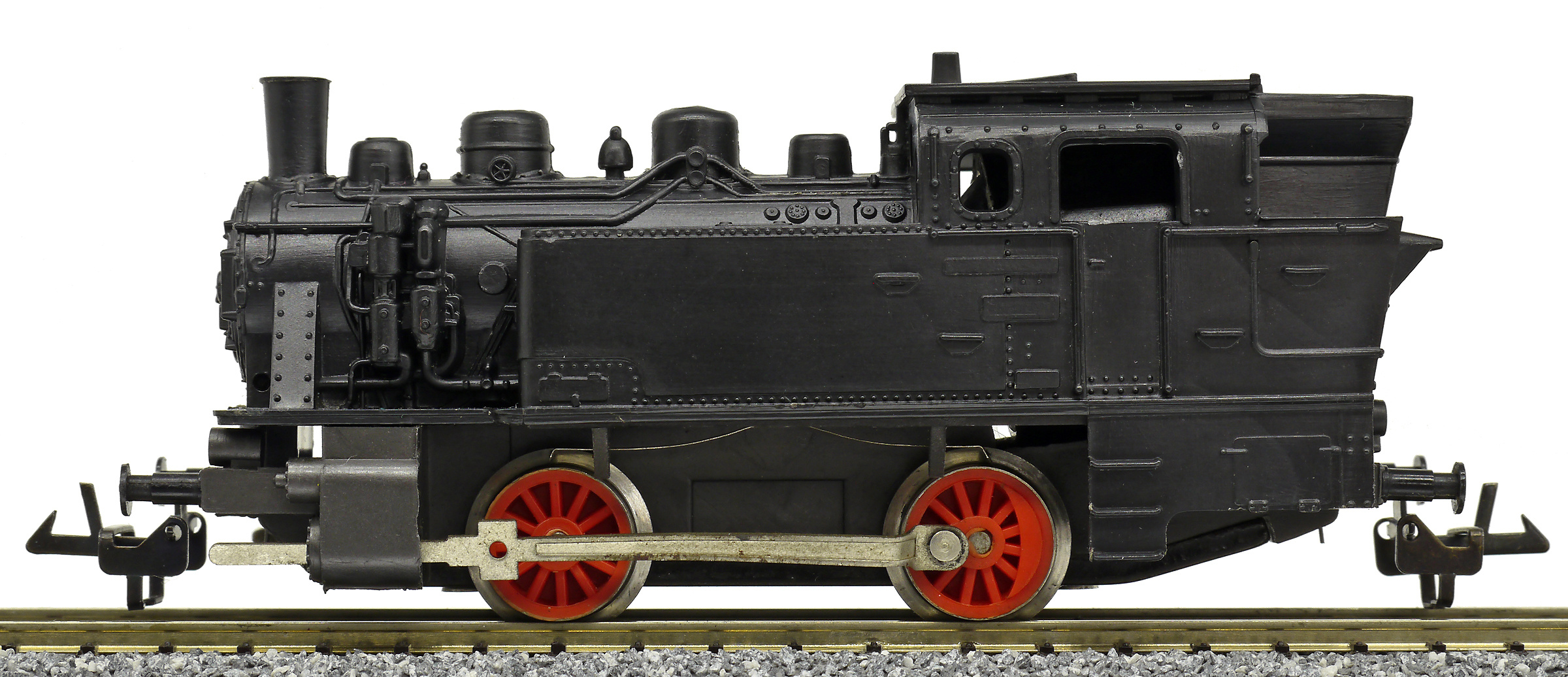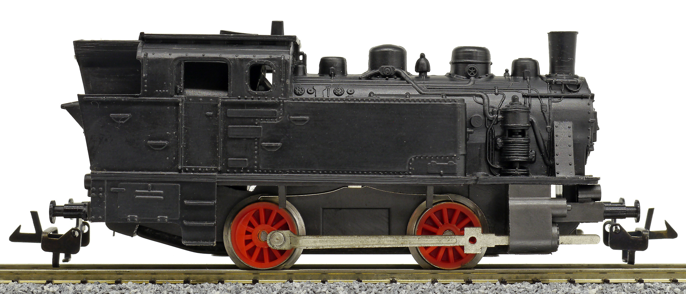 | parní lokomotiva černá v barvě plastu bez potisku, zjednodušený rozvod |