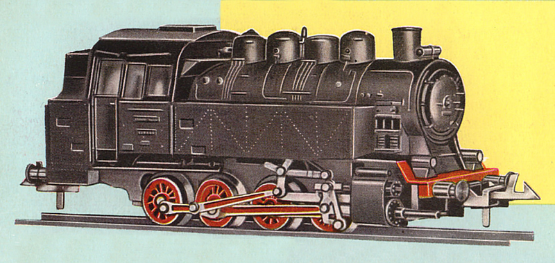 parní lokomotiva černá s červenými koly a rozvodem