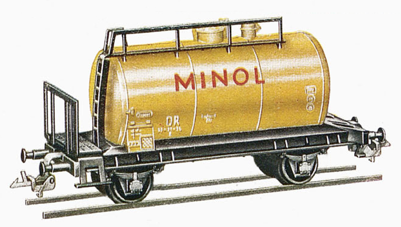 | kotlový vůz žlutý s logem „MINOL“, bez bzd |