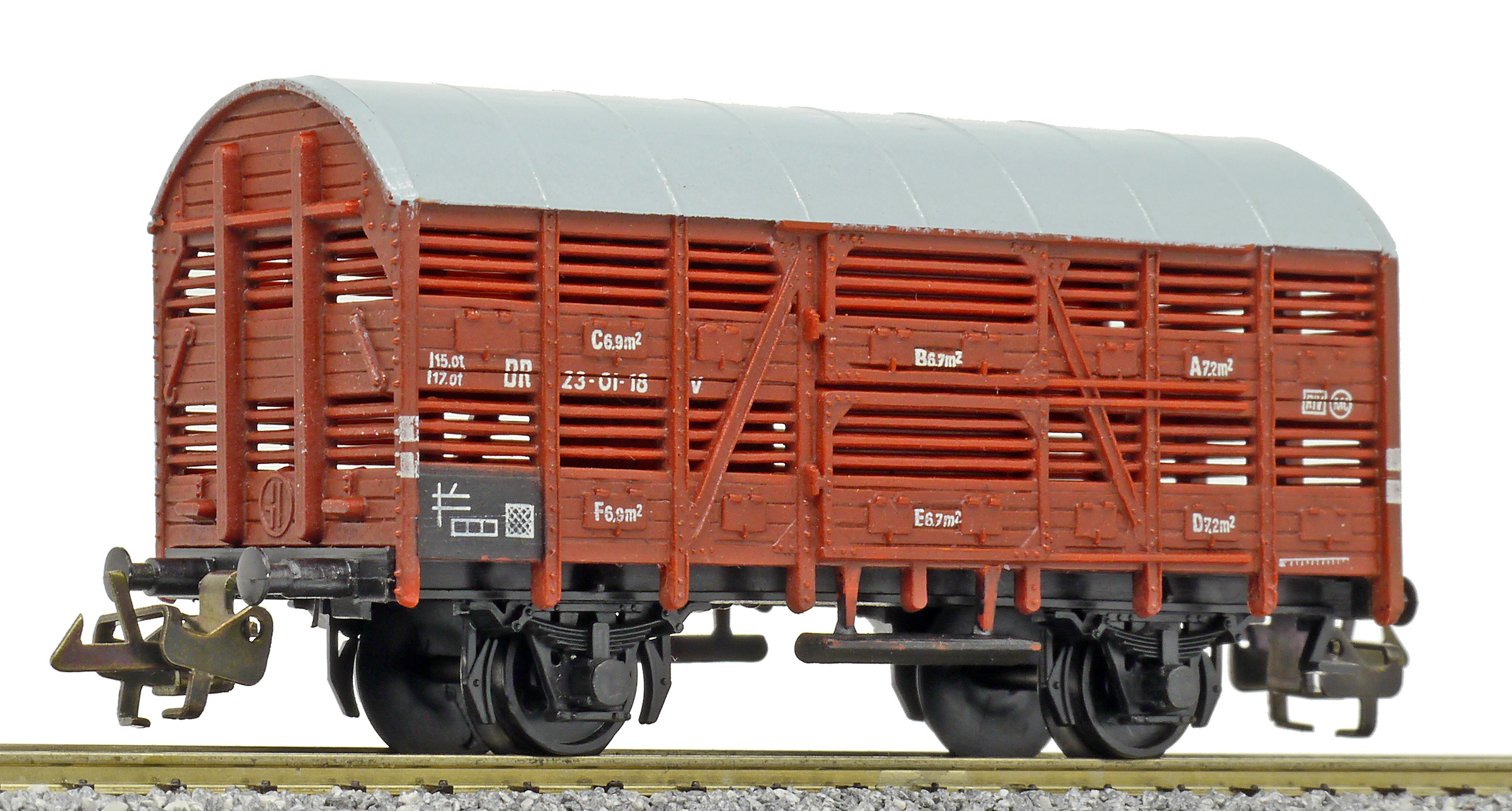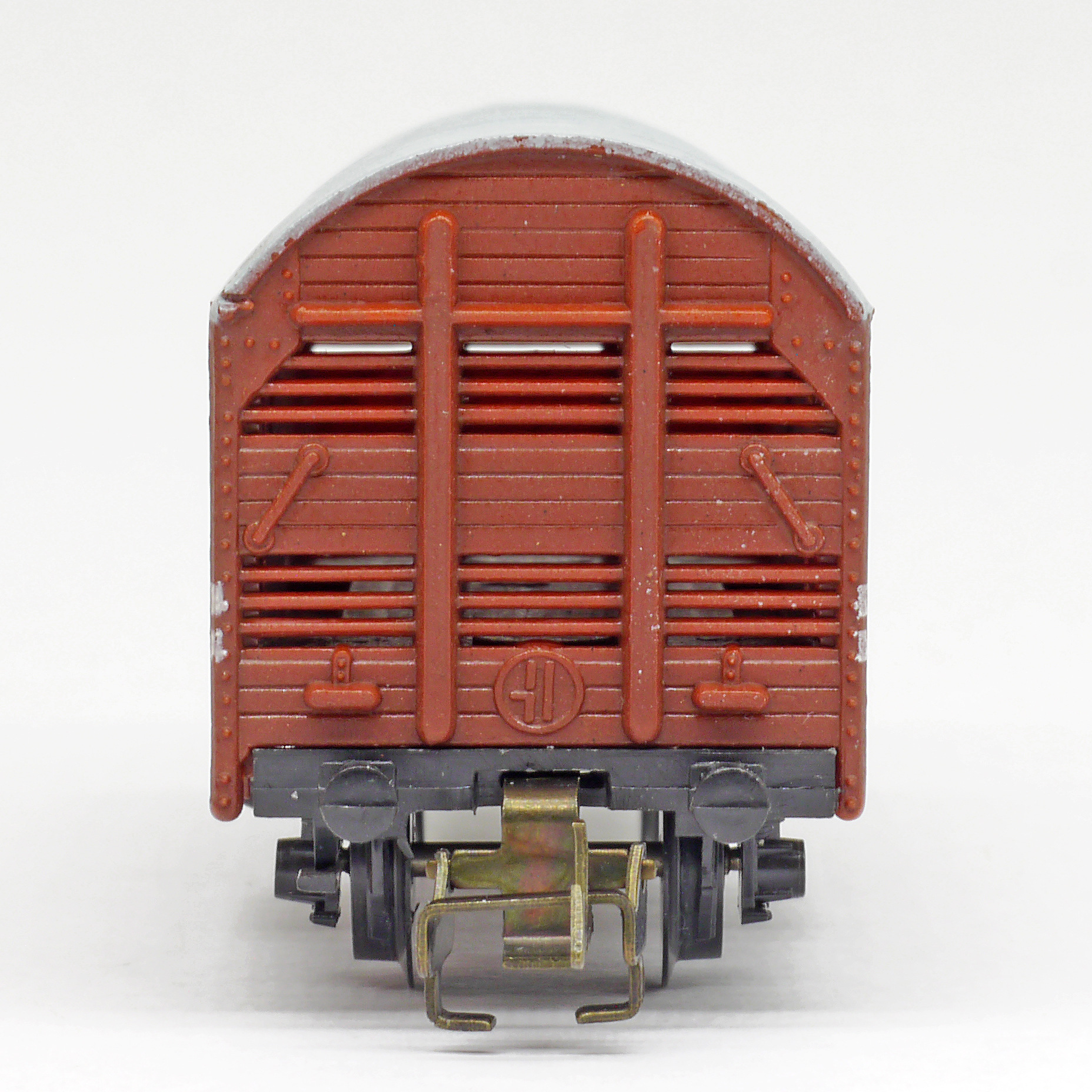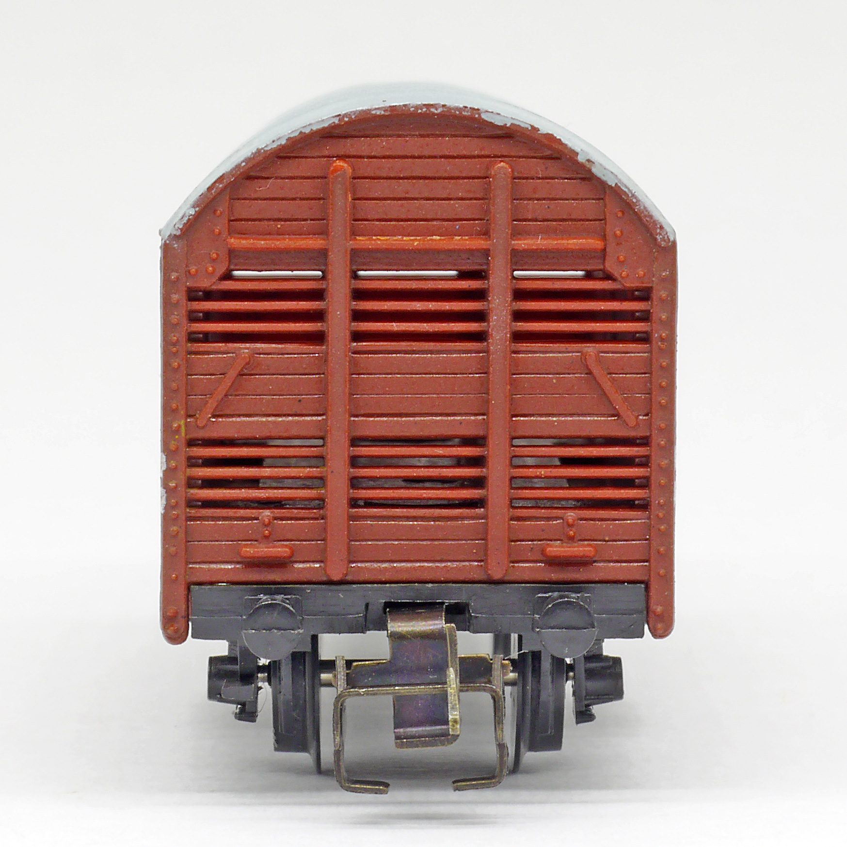 nákladní vůz na přepravu zvířat červenohnědý s šedou střechou
